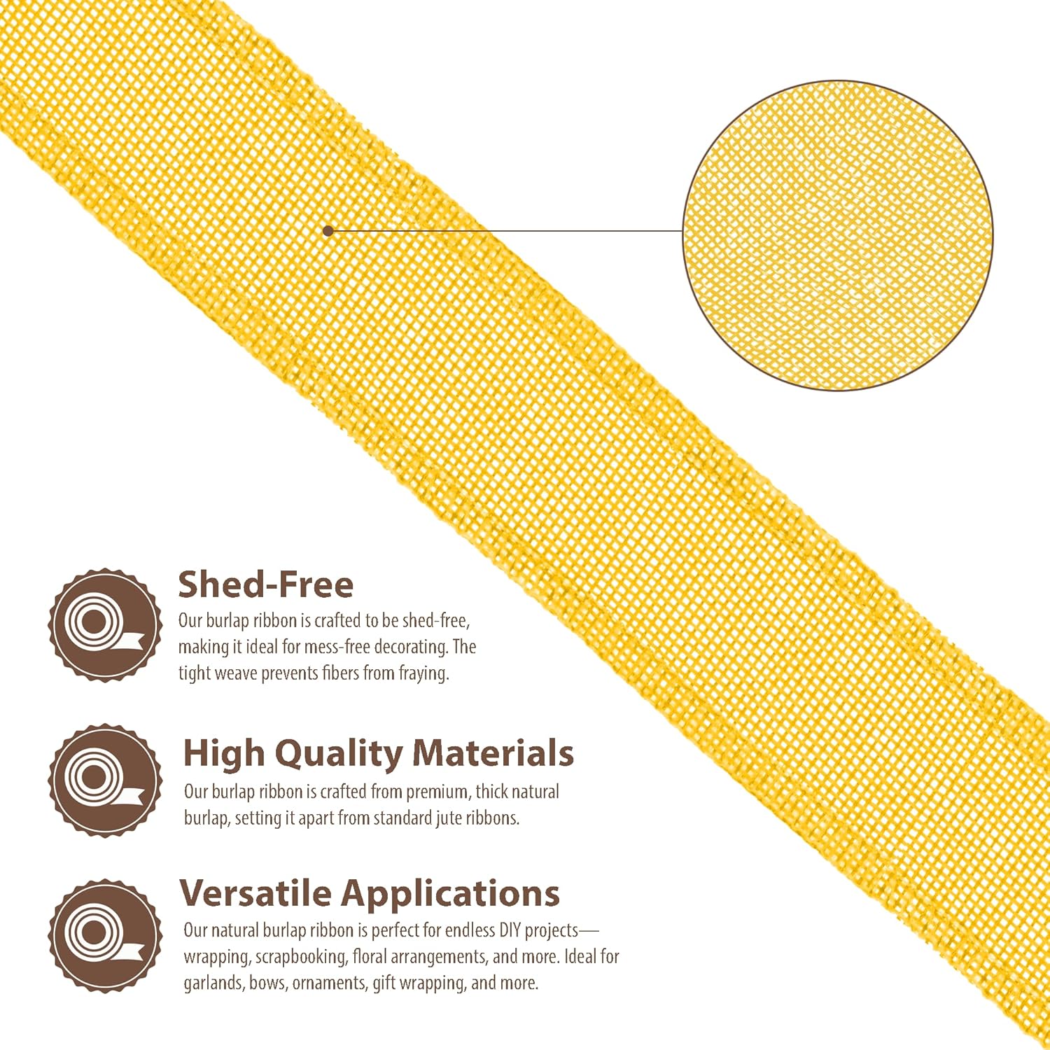 - Wired Burlap Ribbon: Compared to other jute burlap ribbons, our rustic burlaps ribbon with a fray & shed-resistant hemmed edges is made from thicker yellow burlap fabric. The indoor & outdoor colored burlap crafts ribbon is colorfast and will not bleed.