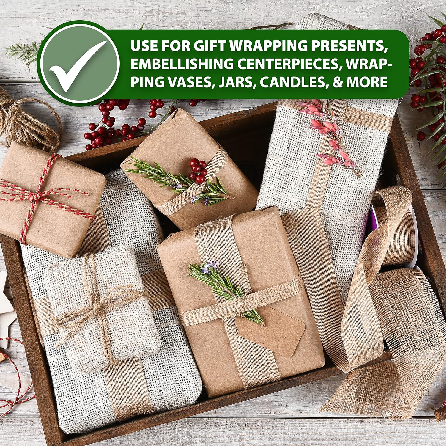- Burlap Pink Wired Ribbons for Wrapping, DIY, Scrapbooking, & Floral Arrangement: The wired rustic ribbon is the ideal colored burlap fabric for garlands, bows, flowers, cards ornaments & curtain tiebacks and gift wrapping ribbon for boxes & baskets.