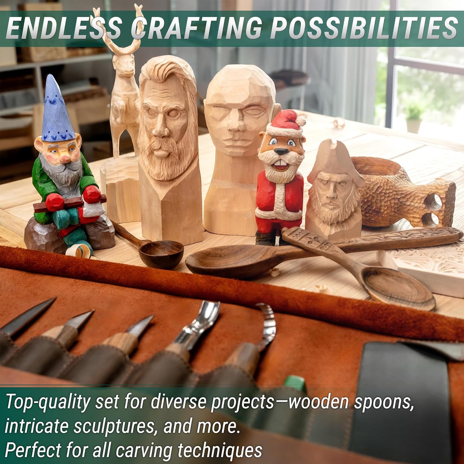 - Whittling Tools in a Genuine Leather Pouch: Keep your whittling tools safe and organized in this genuine leather pouch that will look amazing in your workshop and bring you pleasure with one touch.