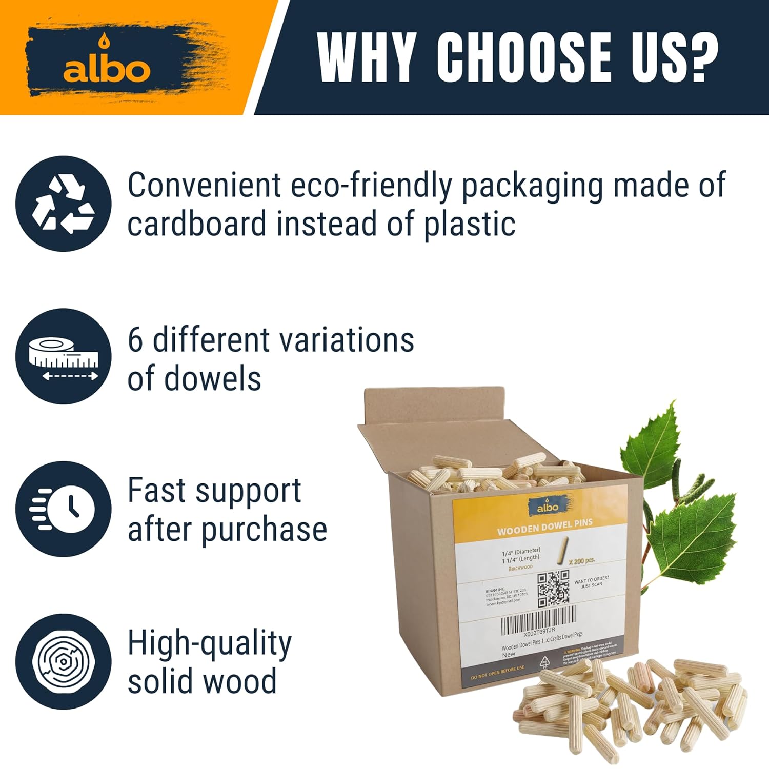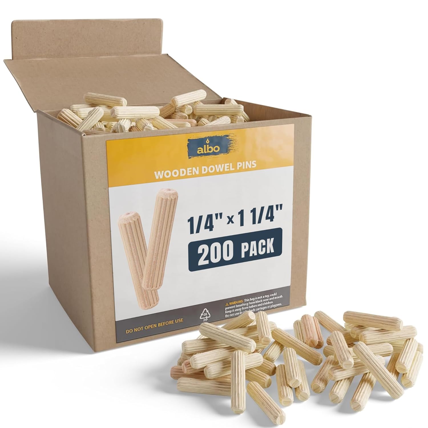 ALBO Wooden Dowel Pins 1/4 x 1-1/4 inch Fluted Wood Dowels Rods 200 Pack Hardwood Crafts Dowel Pegs