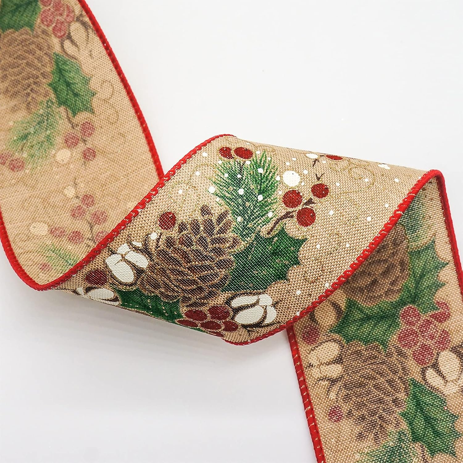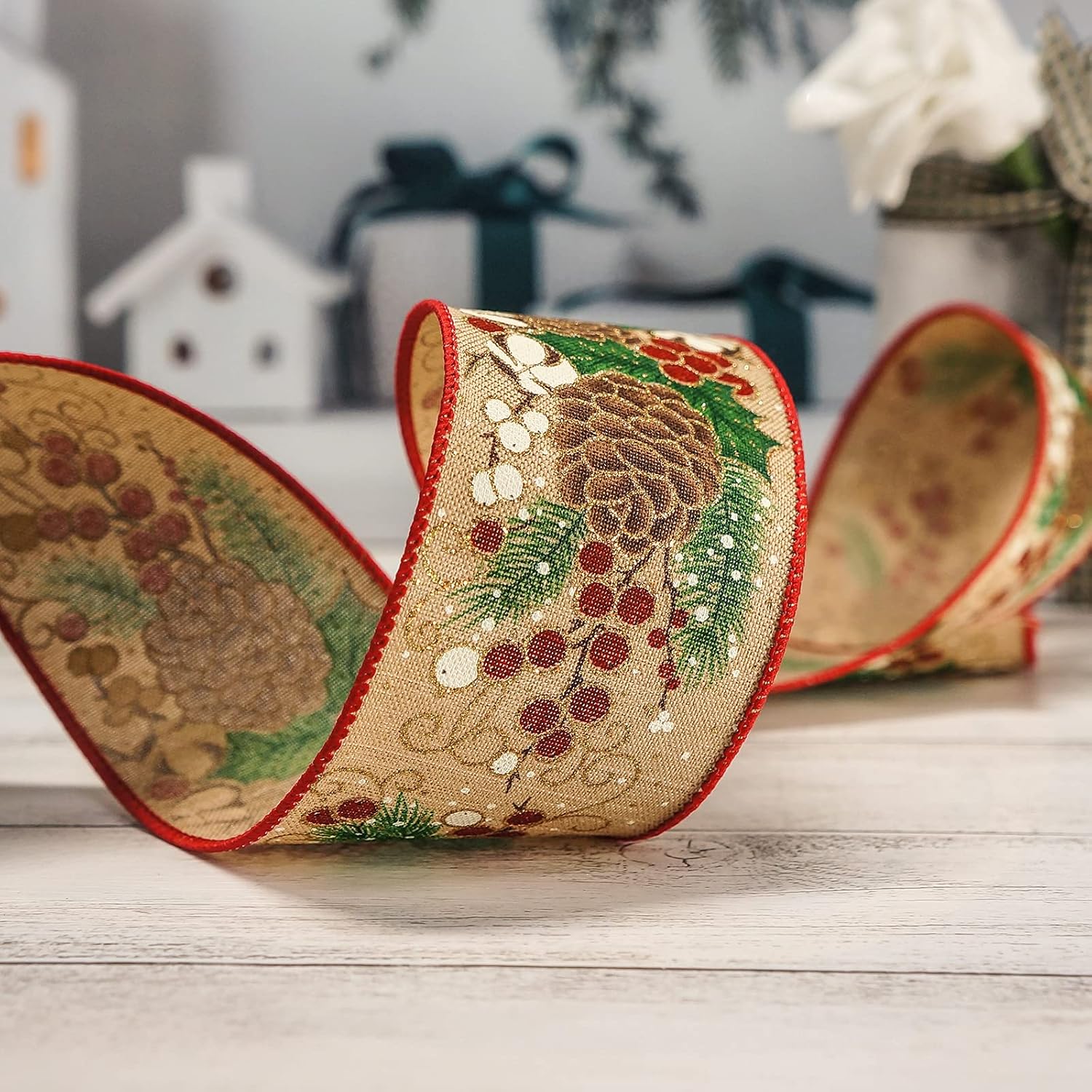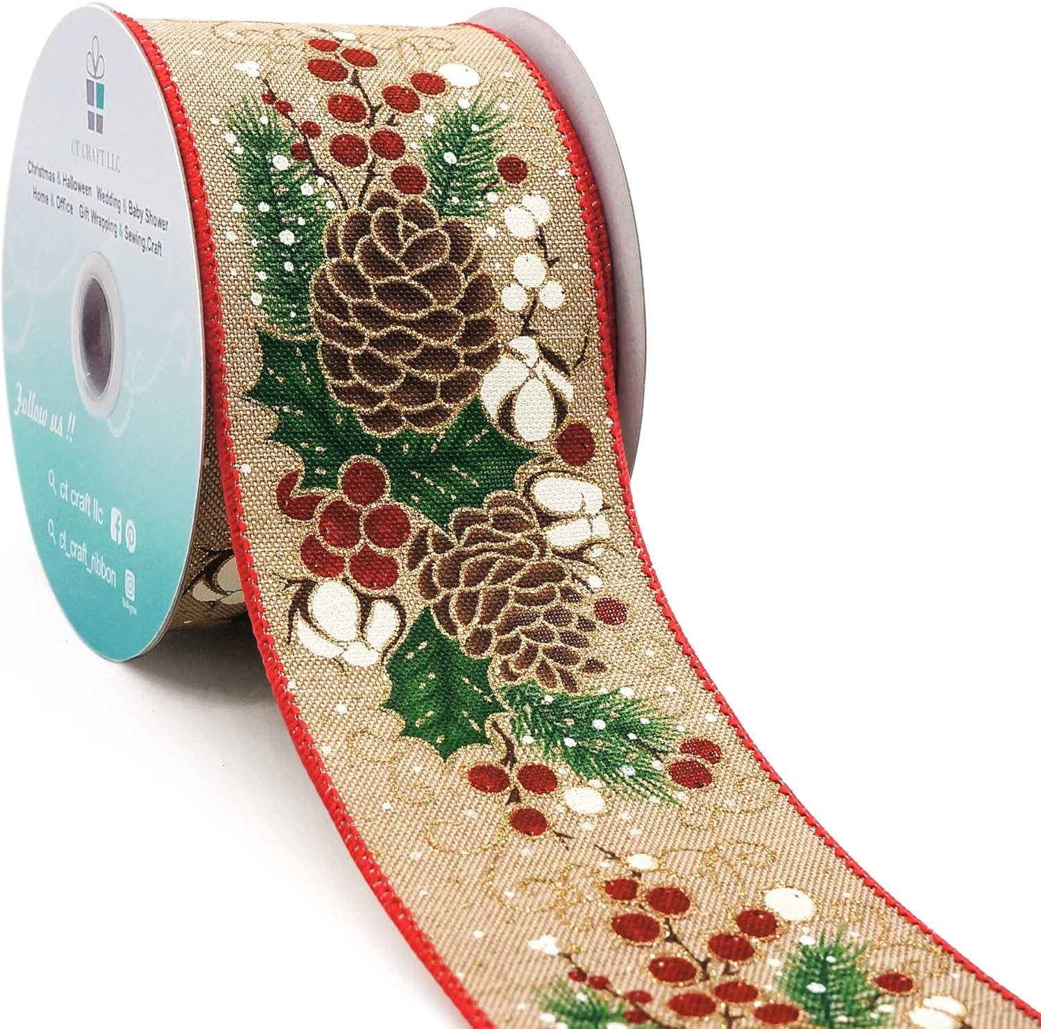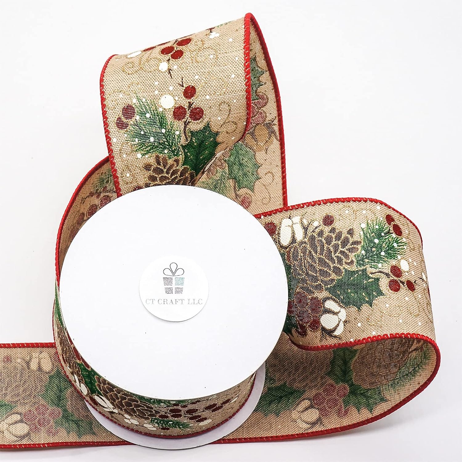 CT CRAFT LLC Tan Faux Jute Burlap with Pinecones Wired Ribbon 2.5 Inch x 10 Yards for Christmas Home Decor Tree Topper Bow Gift Wrapping DIY Crafts Wreath Garland