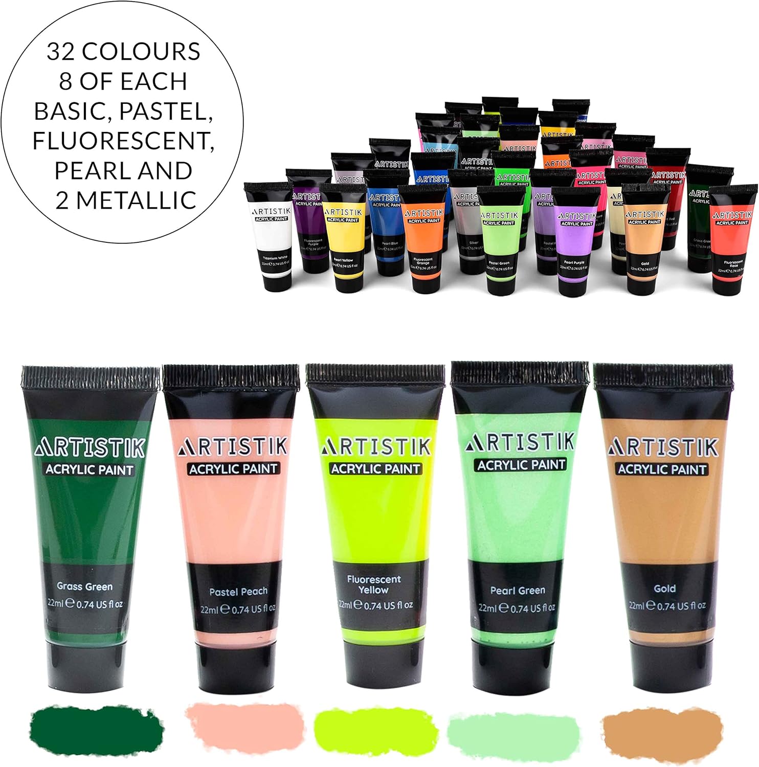 ARTISTIK Acrylic Paint Tube Set of 32-22ml Paint Tubes with 3 Brushes for Adults, Kids and Artists - Non-Toxic Artist Quality Paints for Canvas Painting, Wood Crafts, Ceramic and Art Supplies