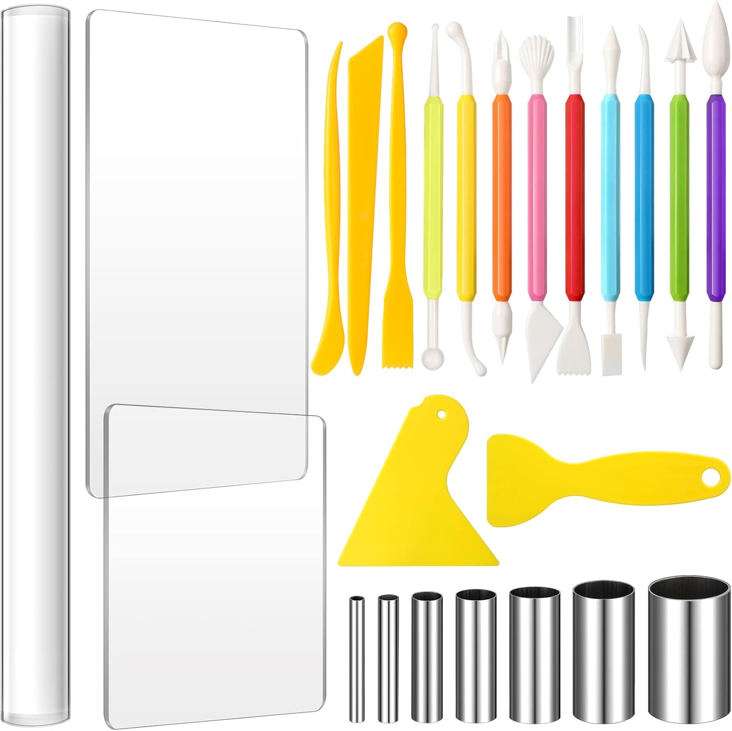 - Specific Contents: 24 pieces clay sculpting tool kits, including 1 acrylic clay roller, 2 acrylic sheets, 2 plastic scraper backing boards, 7 stainless steel round circle shape cutters, 12 polymer clay shaping and sculpting tools, nice combinations to meet your different DIY purposes; Warmly noted: in order to protect our acrylic sheets, there are 2 protective films on the surface of acrylic sheets, which can be torn before use