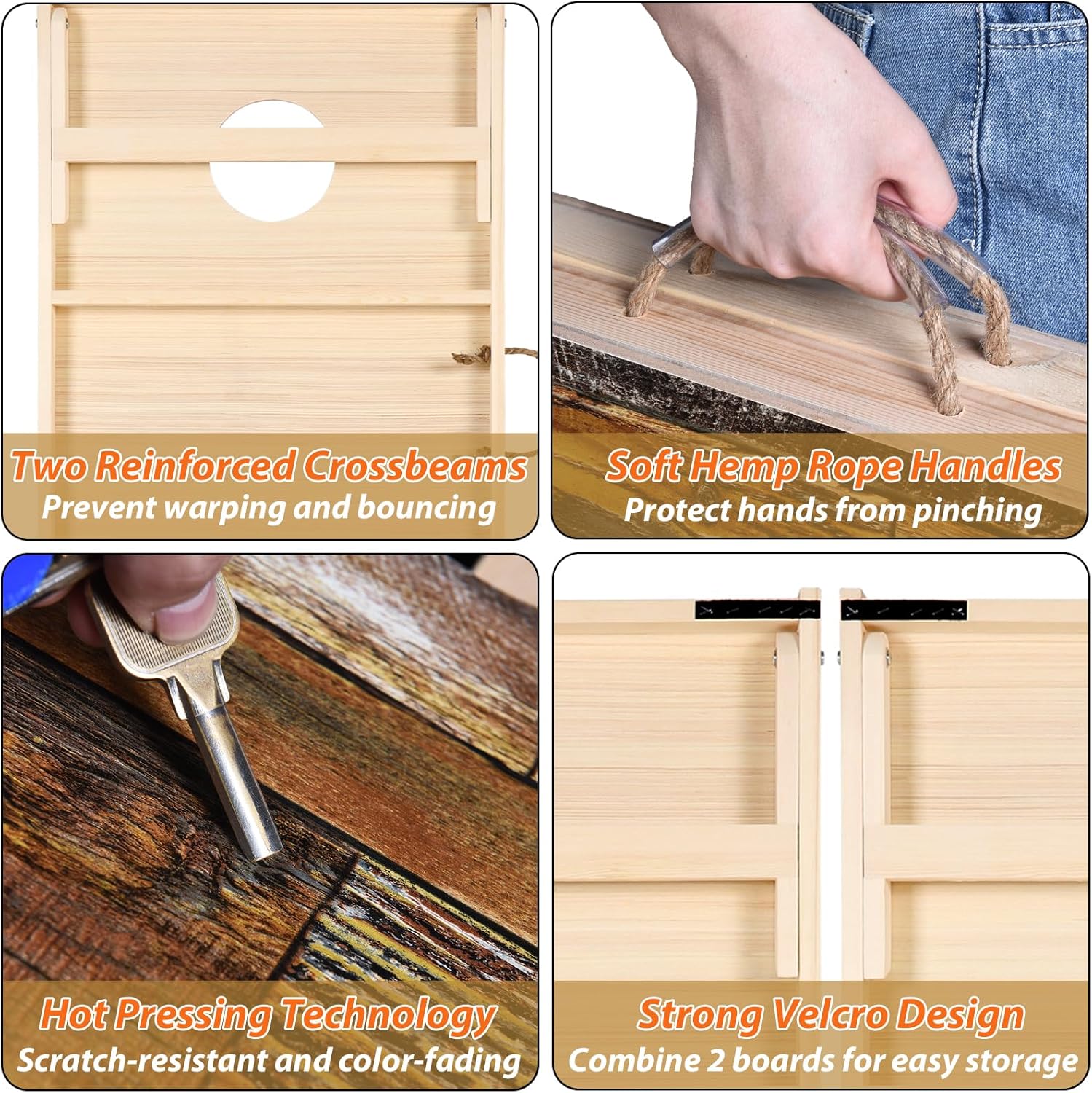 - [HIGH QUALITY & EXQUISITE CRAFTSMANSHIP] Exquisite and unique patterns printed using the latest hot pressing technology, the surface of this corn hole games for adults is scratch resistant and won't fade even when exposed to sunlight, clear varnish is finished with the boards to protect them for years. Each part of the corn hole board is made with high standard craftsmanship to bring the perfect gaming experience to your family and friends, which is believed to be a great choice for gift giving!
