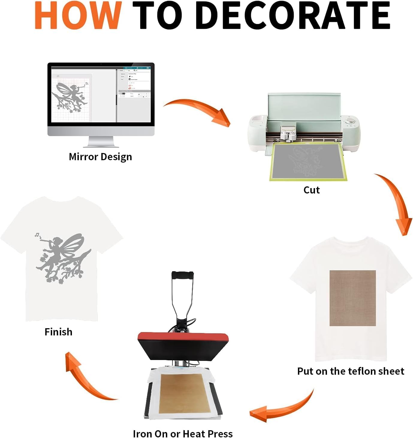 - 【CUSTOMIZABLE & USE WIDELY】12" × 12" pre-cut size Silver Iron on Vinyl Sheet is suitable for use with most popular cutter machines and cutting mat. Our quality HTV Vinyl Bundle can be used to create stunning projects on a wide variety of fabrics such as including 100% Cotton, Cotton/Polyester Blends and even Athletic Mesh fabrics! Personalize your custom t-shirts, tote bags, caps, aprons, pillows and more with our Vinyl HTV !