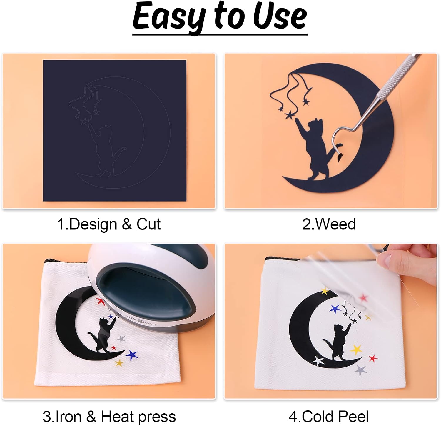 - 【EASY TO CUT & WEED & TRANSFER】 Our premium quality heat transfer vinyl will save your time which you may waste on each image or letter, because you can cut and weed easily through the designs just right.The iron on vinyl is sensitive to temperature and pressure, which can be heat transferred on any t-shirt easily