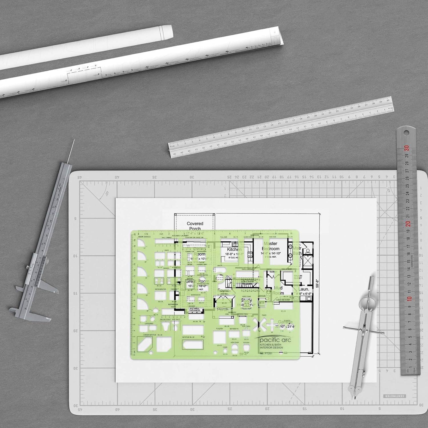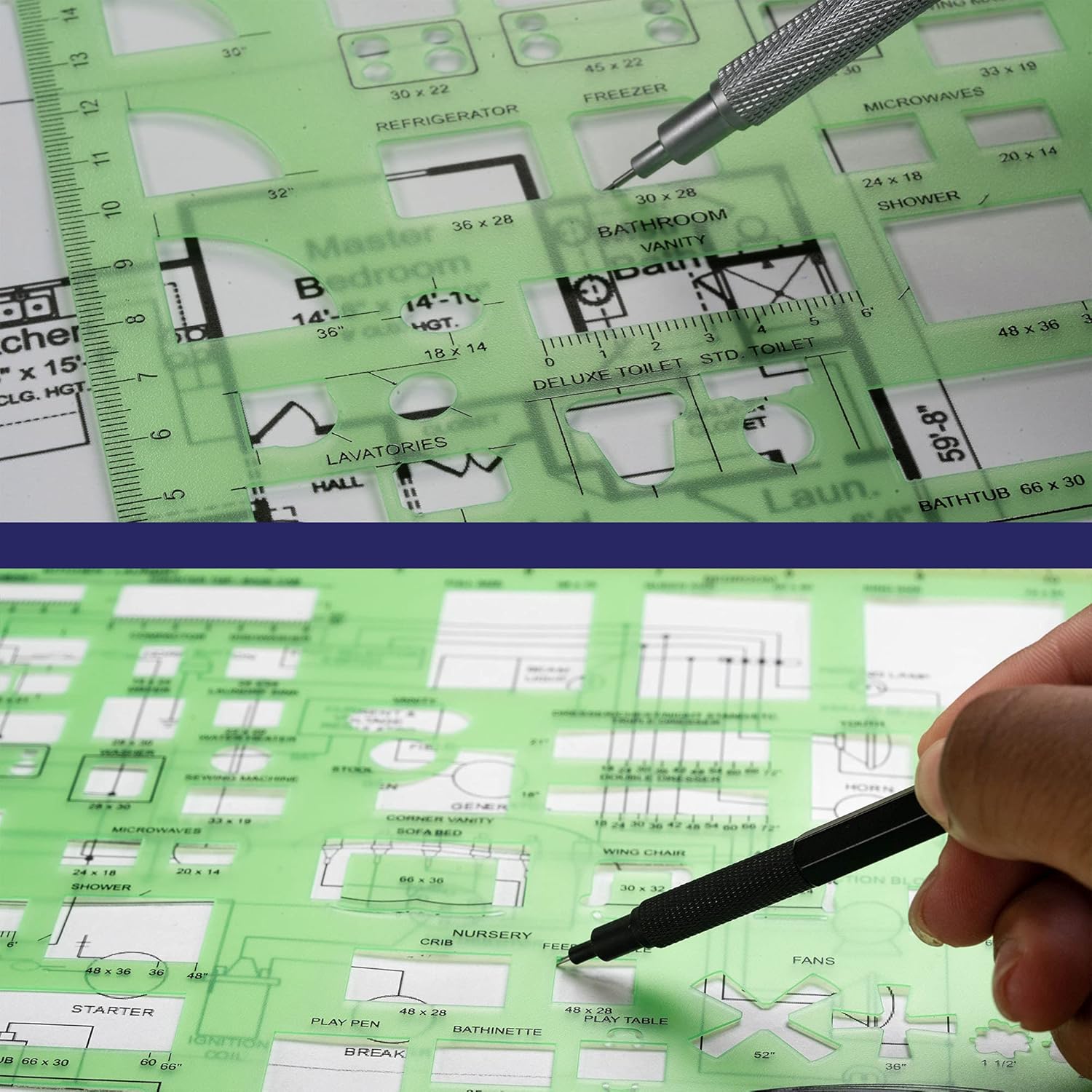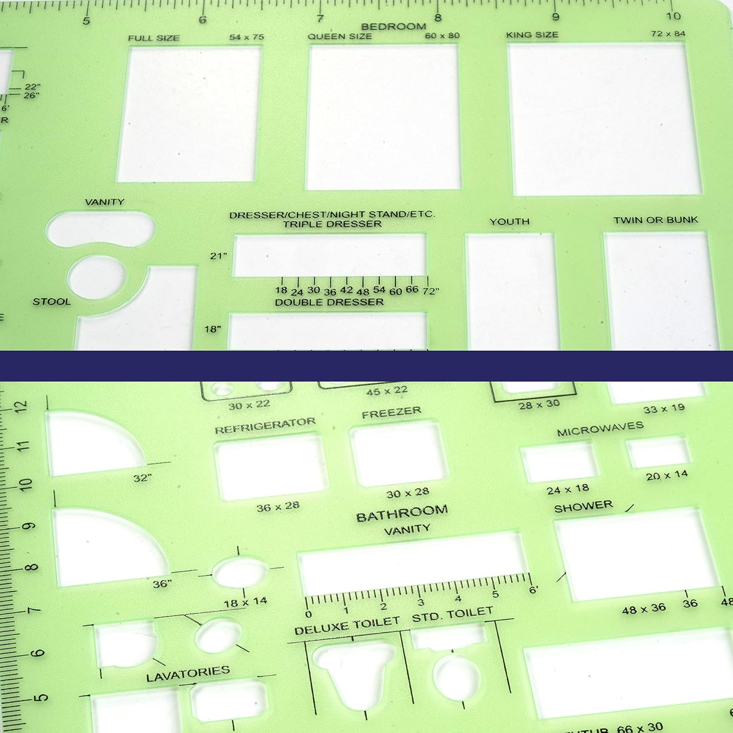 - COMPREHENSIVE TEMPLATE - This template contains symbol furnishings for bedrooms, bathrooms, and kitchens. Features rulers of 10 inches and 20 centimeters. Ideal for students, architects, and interior designers.