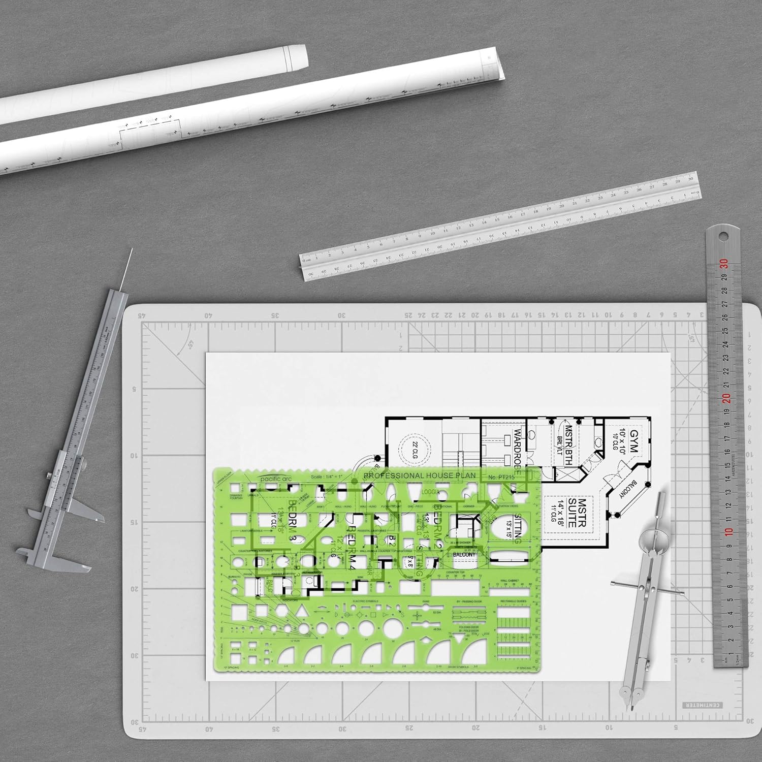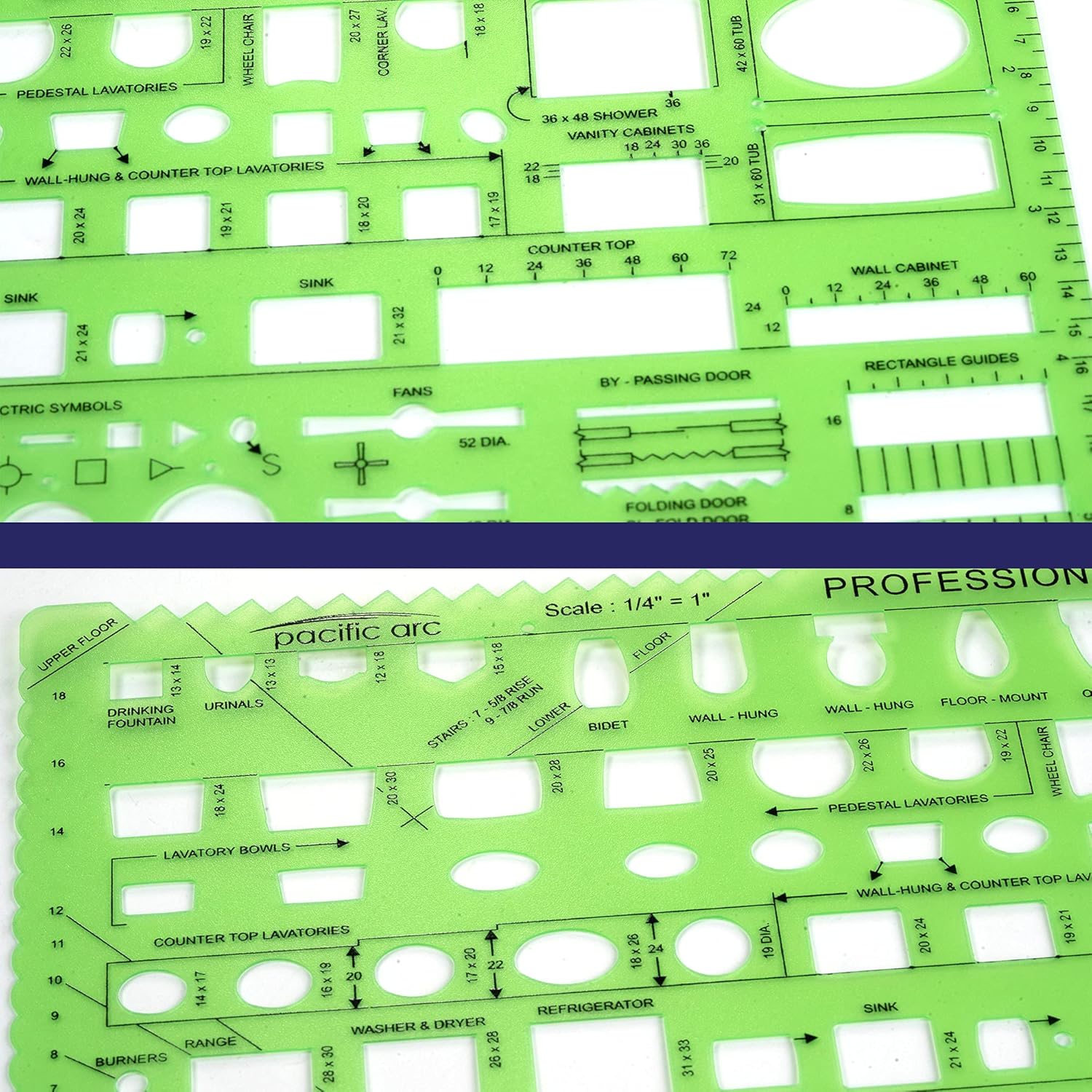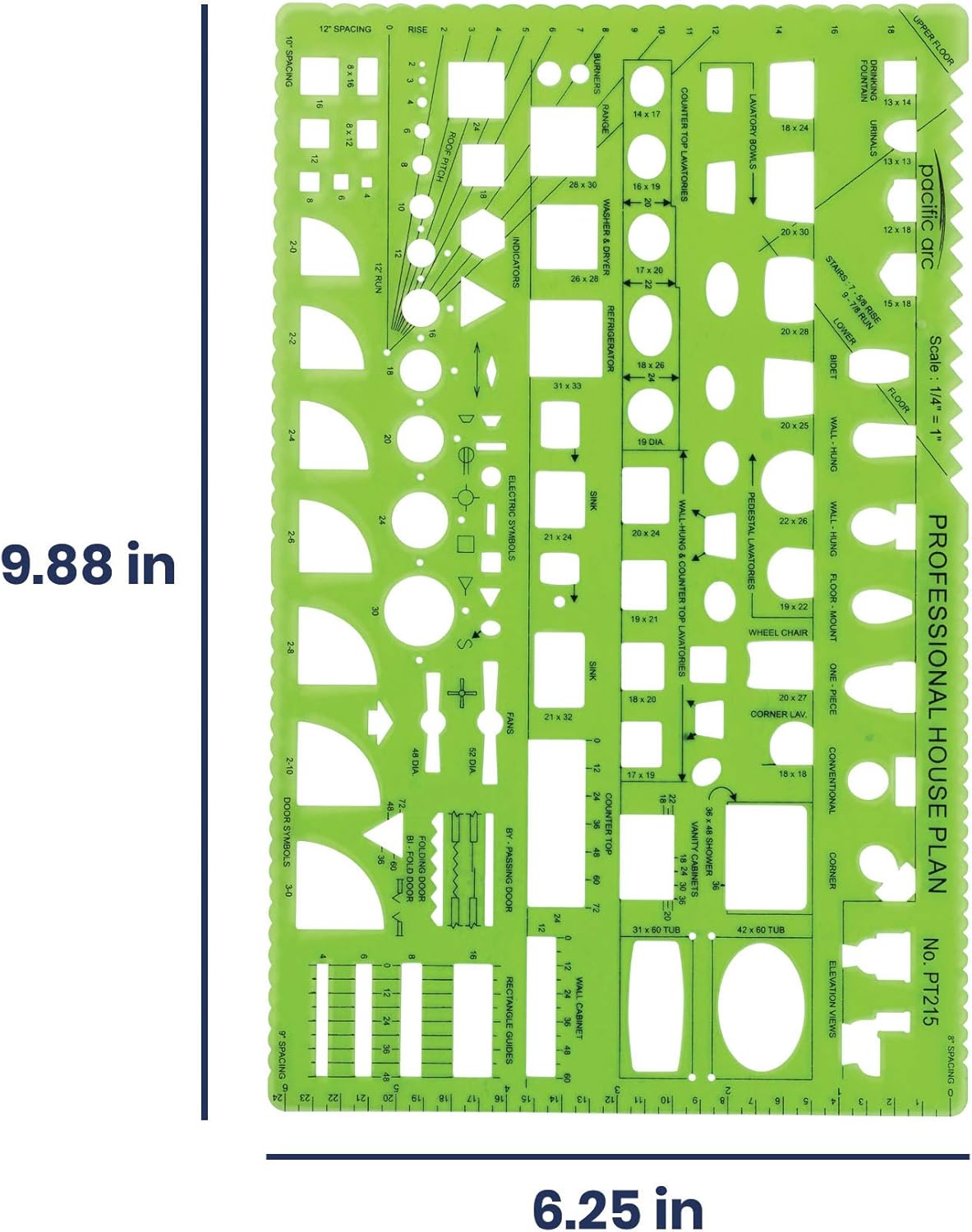 - COMPREHENSIVE TEMPLATE - This template contains guides for doors, kitchen appliances, plumbing fixtures, roof pitch, equal spacing, and rectangle guides. With a scale of 1/4 inch to 1 foot. Ideal for students, architects, and interior designers.