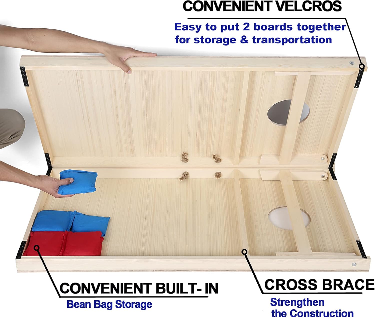 - EXCELLENT SOLID WOOD CONSTRUCTION: The cornhole boards are made from 100% premium wood with sturdy foldable legs support, it is heavy duty and durable enough to prevent warping and bouncing when the bean bag hits them. This high quality cornhole set will bring you a ton of game fun.