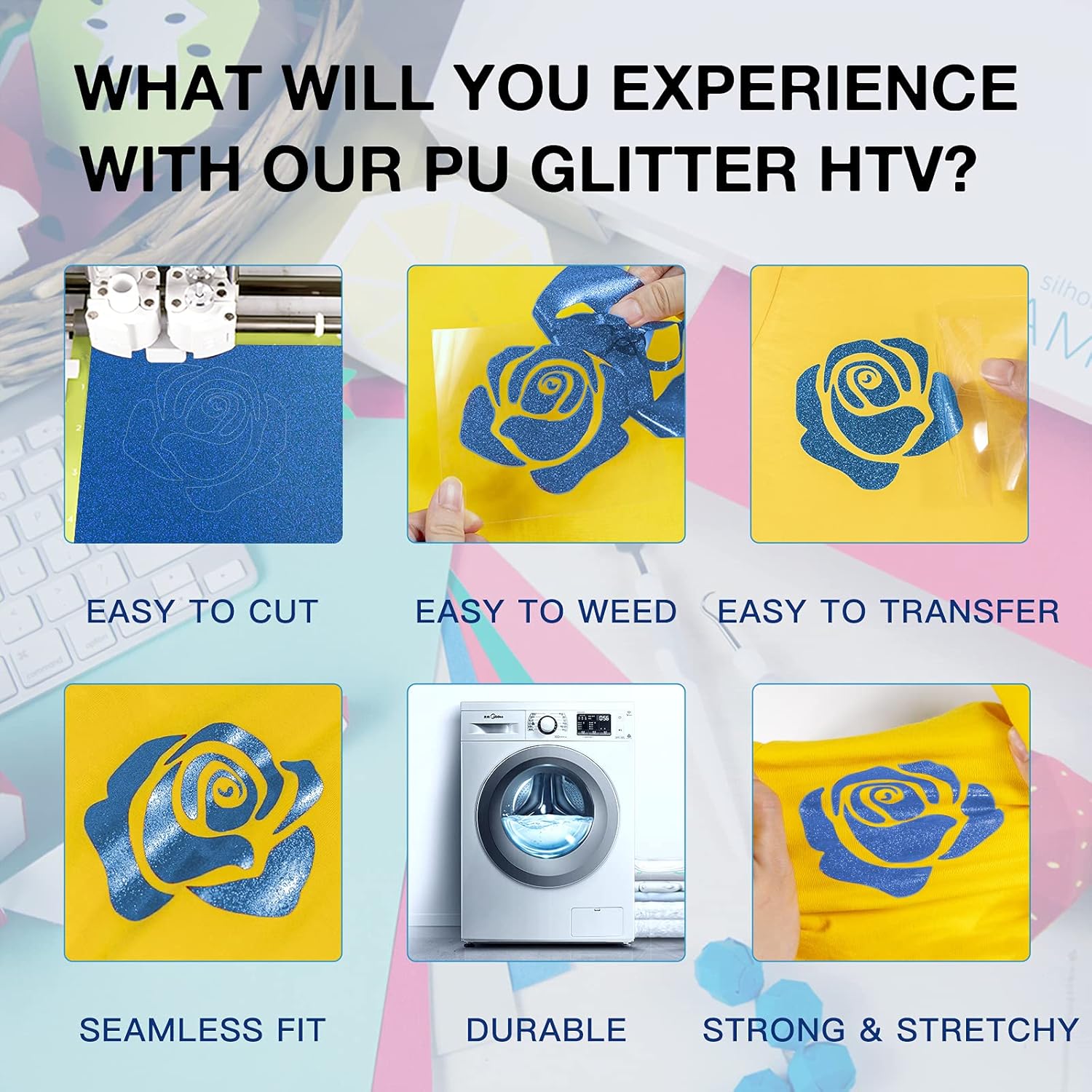 - 【EASY TO CUT WEED TRANSFER】The glitter htv is thick with an excellent cutting application characteristics, any cutters’ blade can cut it through easily. The medium tack transfer film makes weeding like a dream, the glitter heat transfer vinyl is extremely sensitive to heat and pressure makes transfer quickly, which will save your time. The glitter iron on vinyl is sensitive to temperature and pressure, which can be heat transferred on any t-shirt easily