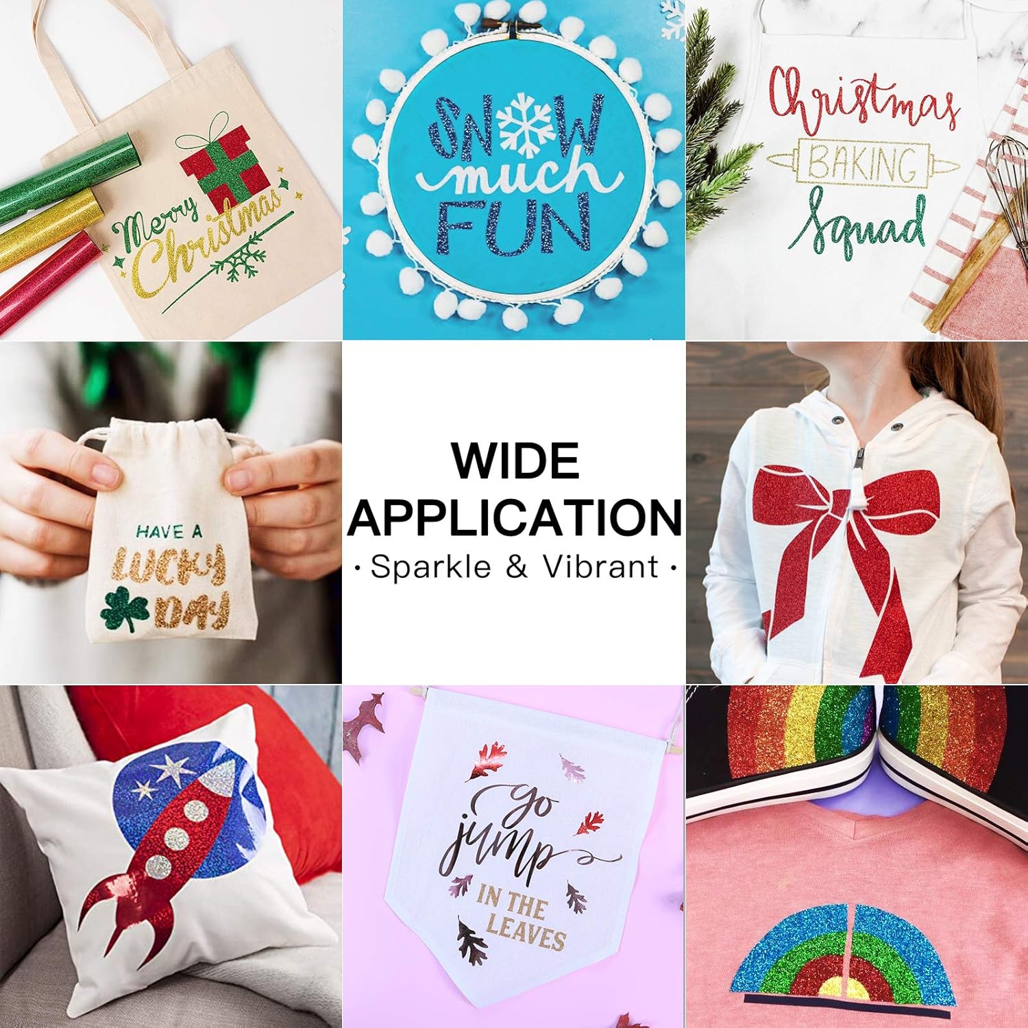 - 【USE WIDELY & SAVE TO WEAR】Your shirt, tote bags, sportswear, aprons, hat and pillow, which use our glitter htv, make you stand out from the crowd. Glitter heat transfer vinyl is suitable for athletic mesh fabrics, Cotton, polyester and cotton blend, lycra/spandex, textiles etc. Our glitter htv vinyl materials are SGS certified and are safe to wear