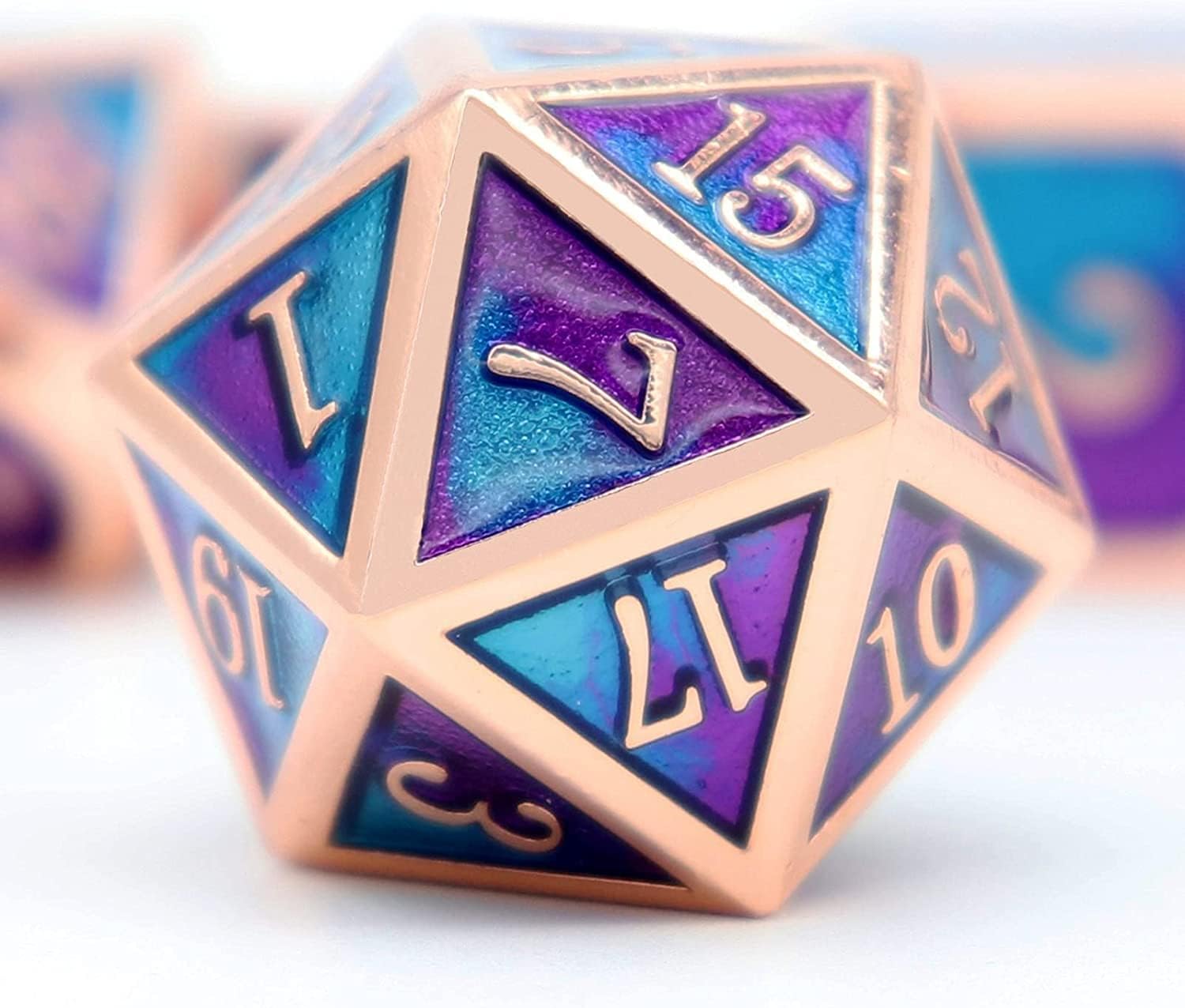 - Copper Rosegold Metal DND Dice Set- 7pcs metal dice for role playing games: 1xD20, 1xD12, 2xD10(one 00-90, one 0-9), 1xD8, 1xD6, 1xD4, 1XLeather Dice Bag