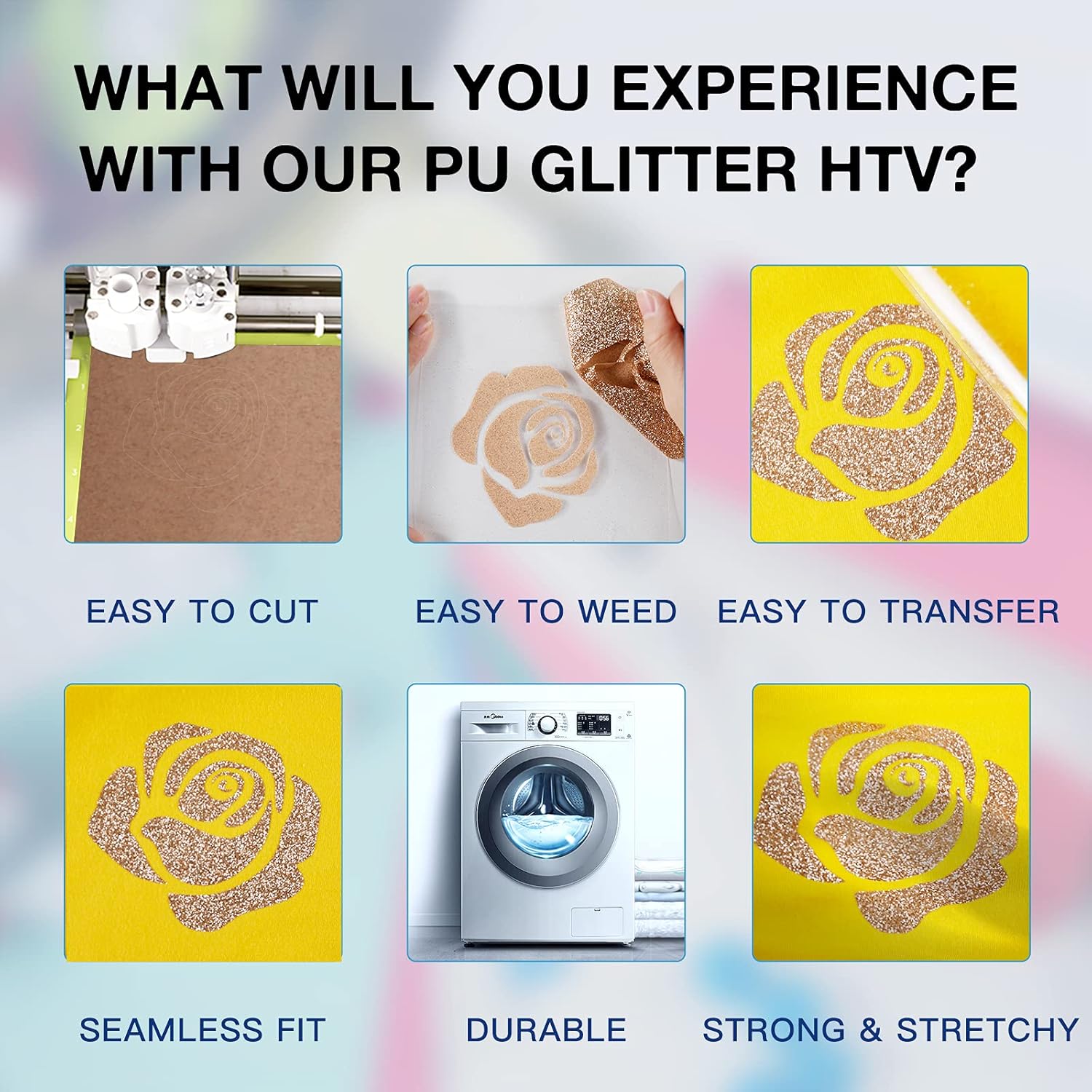 - 【EASY TO CUT WEED TRANSFER】The glitter htv is thick with an excellent cutting application characteristics, any cutters’ blade can cut it through easily. The medium tack transfer film makes weeding like a dream, the glitter heat transfer vinyl is extremely sensitive to heat and pressure makes transfer quickly, which will save your time. The glitter iron on vinyl is sensitive to temperature and pressure, which can be heat transferred on any t-shirt easily