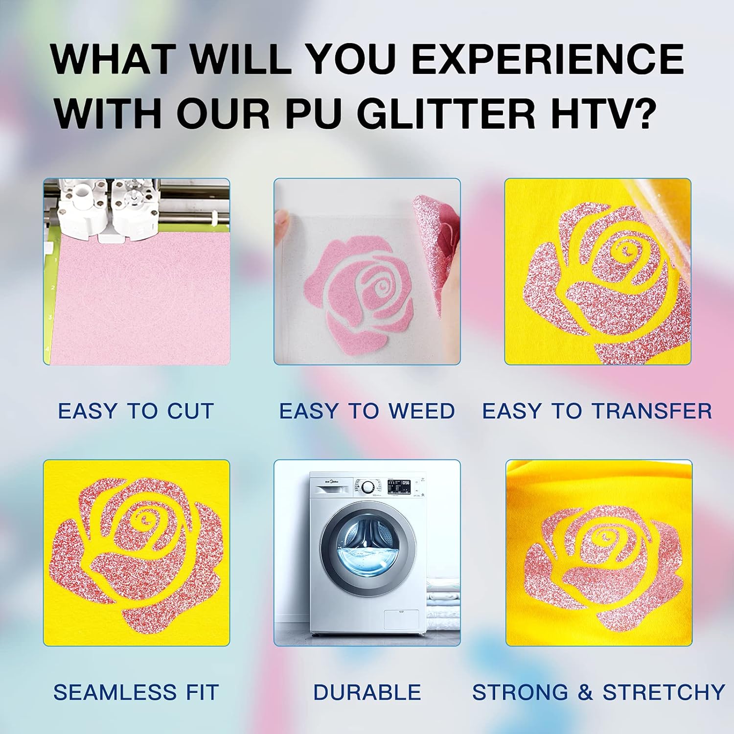 - 【EASY TO CUT WEED TRANSFER】The glitter htv is thick with an excellent cutting application characteristics, any cutters’ blade can cut it through easily. The medium tack transfer film makes weeding like a dream, the glitter heat transfer vinyl is extremely sensitive to heat and pressure makes transfer quickly, which will save your time. The glitter iron on vinyl is sensitive to temperature and pressure, which can be heat transferred on any t-shirt easily