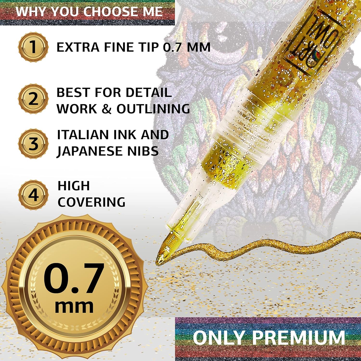 - Set of 12 extra fine 0.7mm acrylic glitter paint pens for drawing super thin lines and fine details.