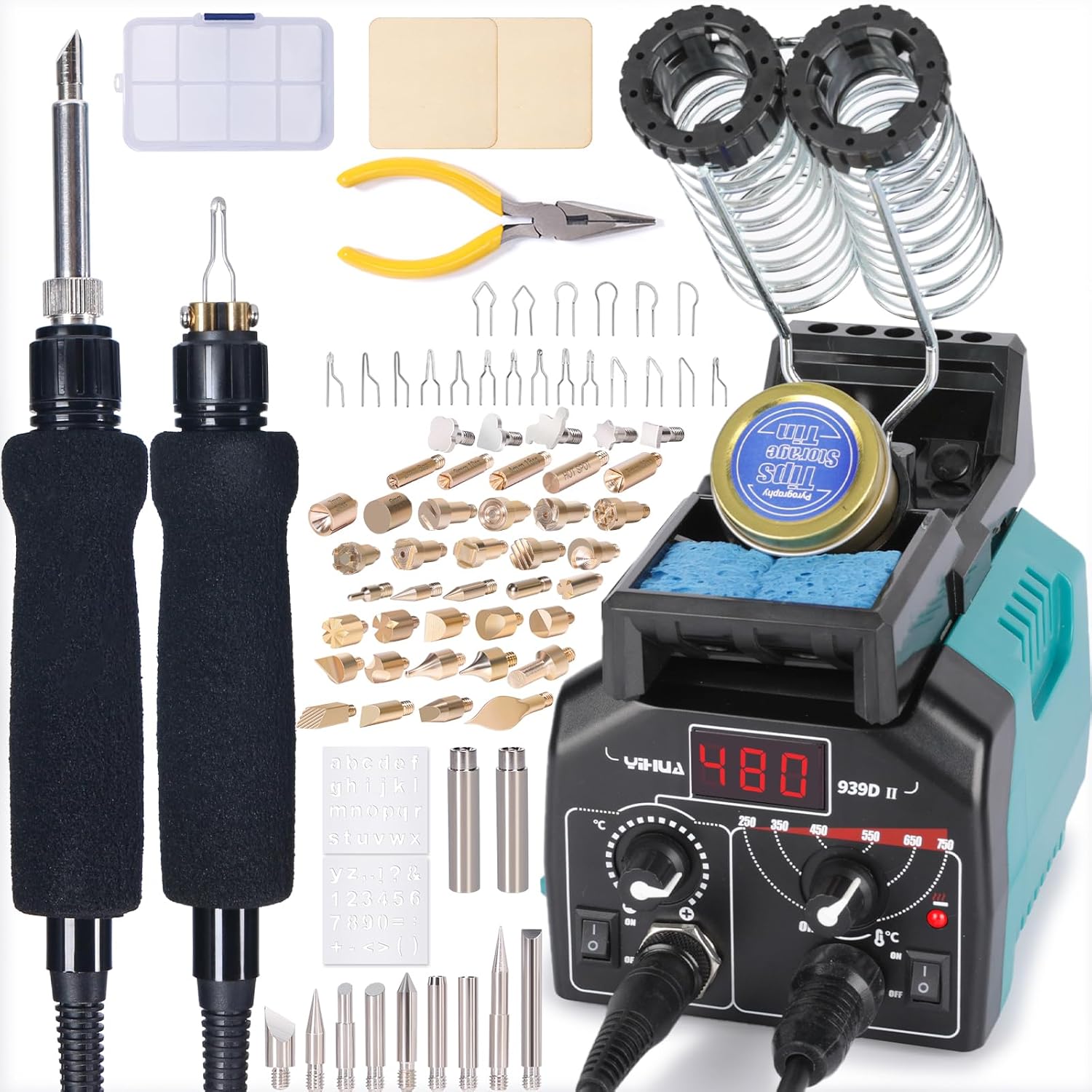 YIHUA 939D-II Pyrography Pen Wood Burning Kit Station 2-in-1 Solid-Point 200~480°C (with Temp Display)/Wire-Nib 250~750°C with 20 Nibs, Solid Points, 1 Stable Pen Holder, 2 Scrap Wood (Green)