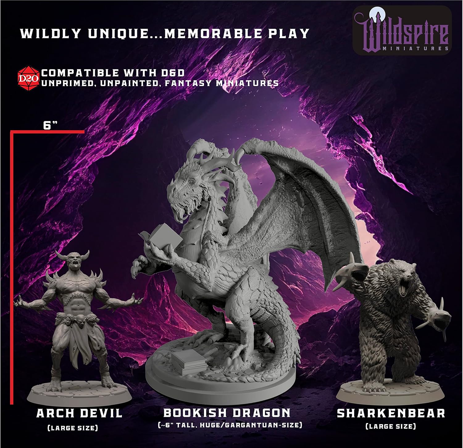 Wildspire Fantasy Monsters & Bookish Dragon for DND Miniatures Unpainted Bulk 28mm-32mm Dungeons & Dragons Minis Pathfinder Figures Fantasy Unpainted Tabletop RPG Miniature Starter Set for D&D