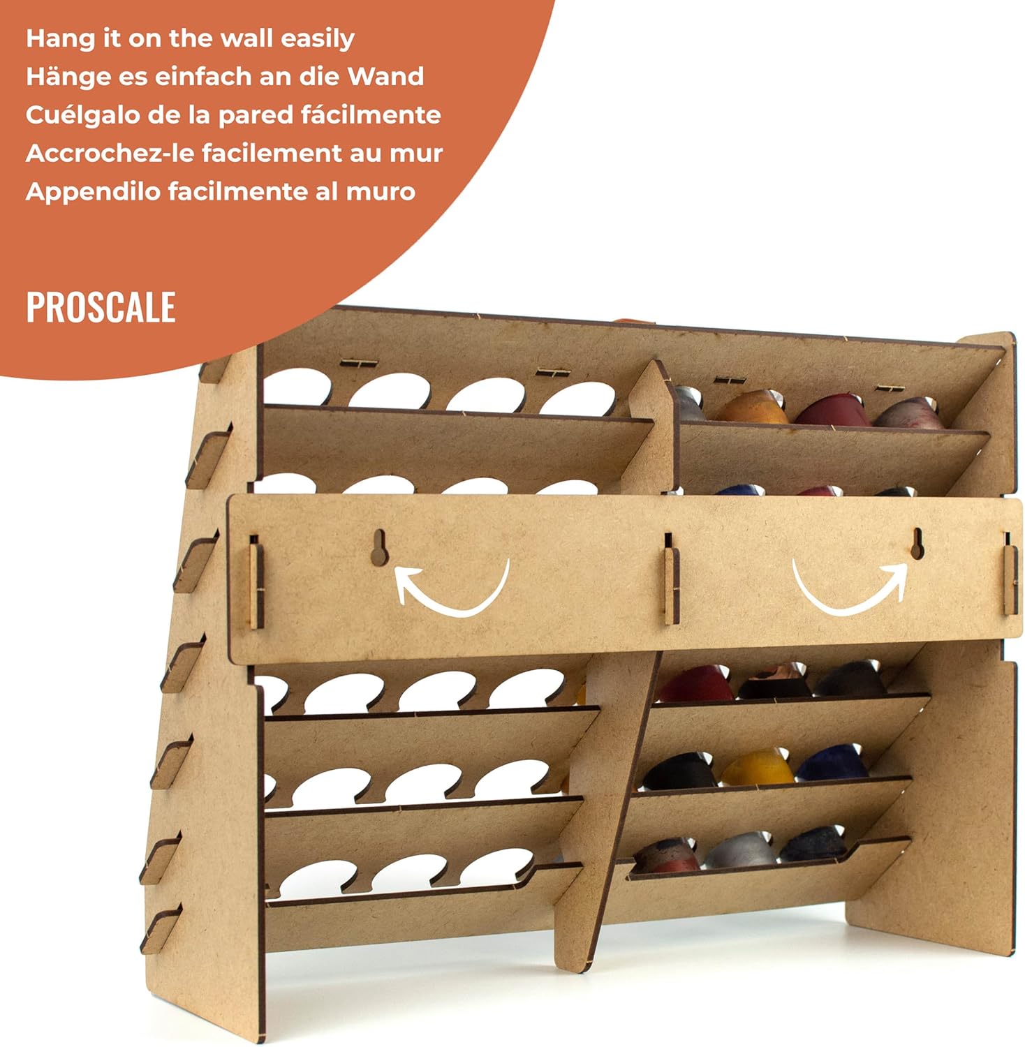 - HANDCRAFTED MANUFACTURE: The wall-mounted paint organiser kit for miniatures is a stand made in Spain. Thank you for supporting local trade. Please check the diameter of your acrylic pots before purchasing.