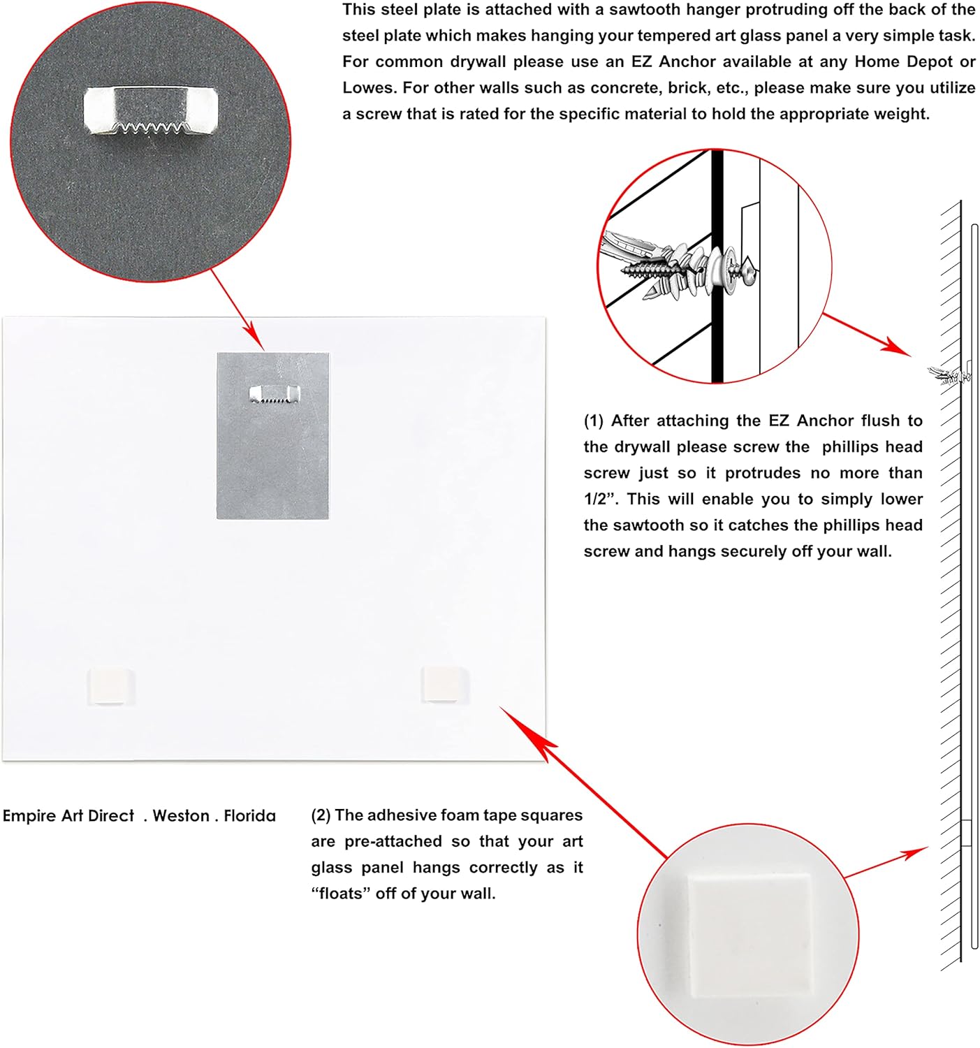 - PROTECTION & INSTALLATION - Shrink wrapped in carton with high-strength styrofoam protective corners. 1 strong steel hanger is attached to the back of the product for quick and easy installation. Digital super high resolution printing artwork on ultra white tempered glass. Vivid color create the feel of natural and masterpiece, bring a immersive experience to you. Waterproof, color fading-resistant and easy-cleaning.