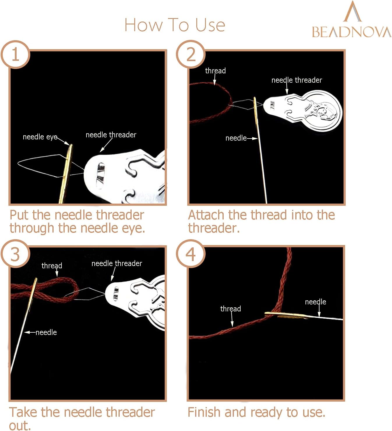 - EASY TO USE: Insert the wire loop on the needle threader through the eye of the needle. Insert the thread tail through the wire loop at least a few inches in length. Fold the tail over and hold both lengths of thread together. Pull the wire loop out from the eye of the needle and ensure the thread tails comes through with it.
