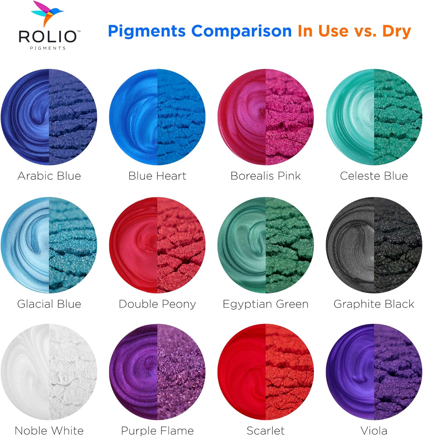 - FINE PIGMENTS - Rolio’s fine pigments are formulated to be safe and easy to use for any project. With 12 high intensity colors you can mix to create any color you can imagine! Comes with: Graphite Black, Noble White, Egyptian Green, Celeste Blue, Persian Green, Olive Gold, Canary Yellow, Aureolin Yellow, Turmeric Gold, Tiger Orange, Coral Rose, Scarlet - Rolio
