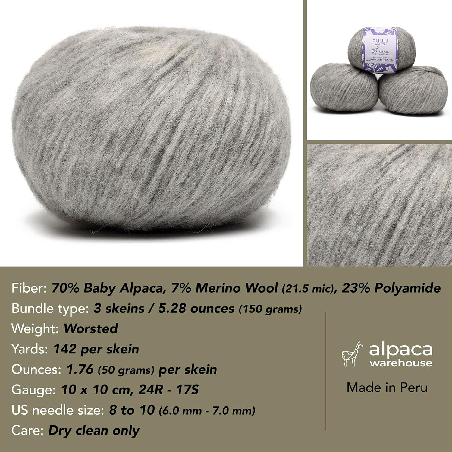 Pullu - Baby Alpaca Merino Wool Yarn Set of 3 Skeins (150 Grams) Worsted Weight - Sourced Directly from Peru - Heavenly Soft and Perfect for Knitting and Crocheting (Heather Silver Gray)
