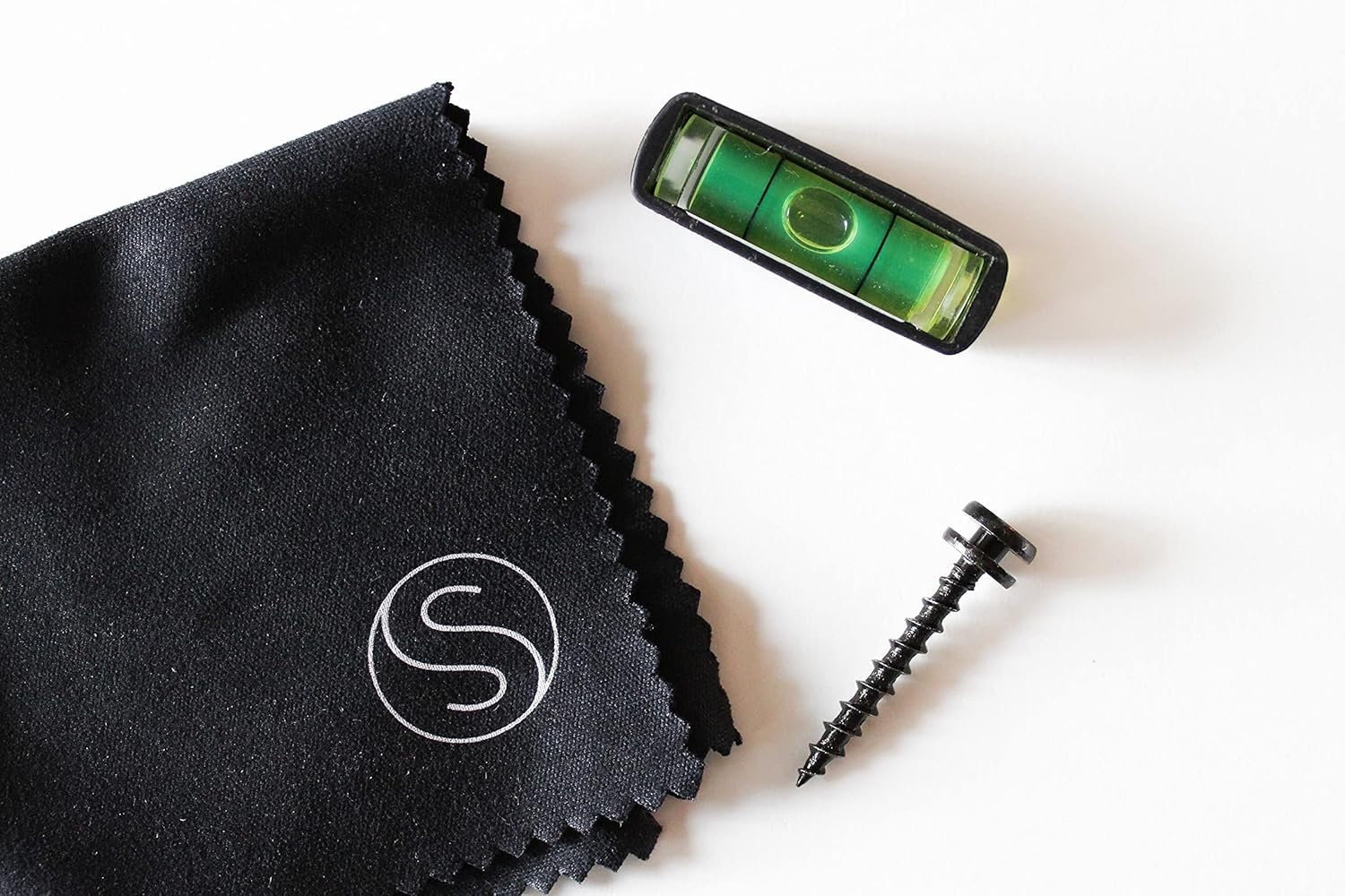 - No Fuss Hanging and Installation with Helpful Freebies. Template with Guide Marks, Bubble Level for Perfect Placement and Alignment. Non-Slip Cork Bumpers on Back of Glass with Specially Designed Screw for Modern Levitating Effect.
