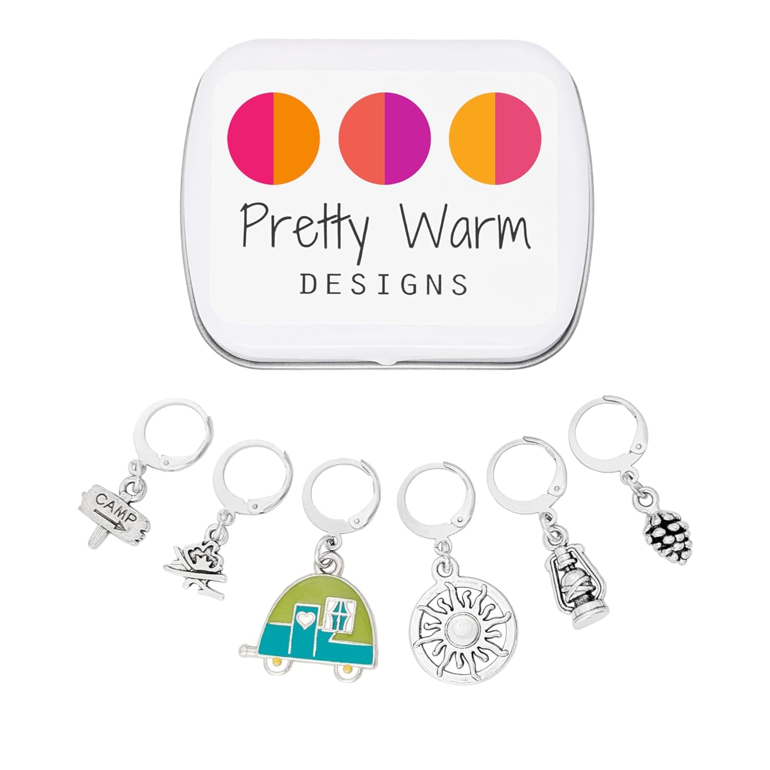 Go Camping Locking Stitch Markers with Storage Case | Crochet Stitch Markers & Removable Knitting Progress Keepers | Camper, Campfire, Lantern & Pinecone Charms | Handmade by Pretty Warm Designs