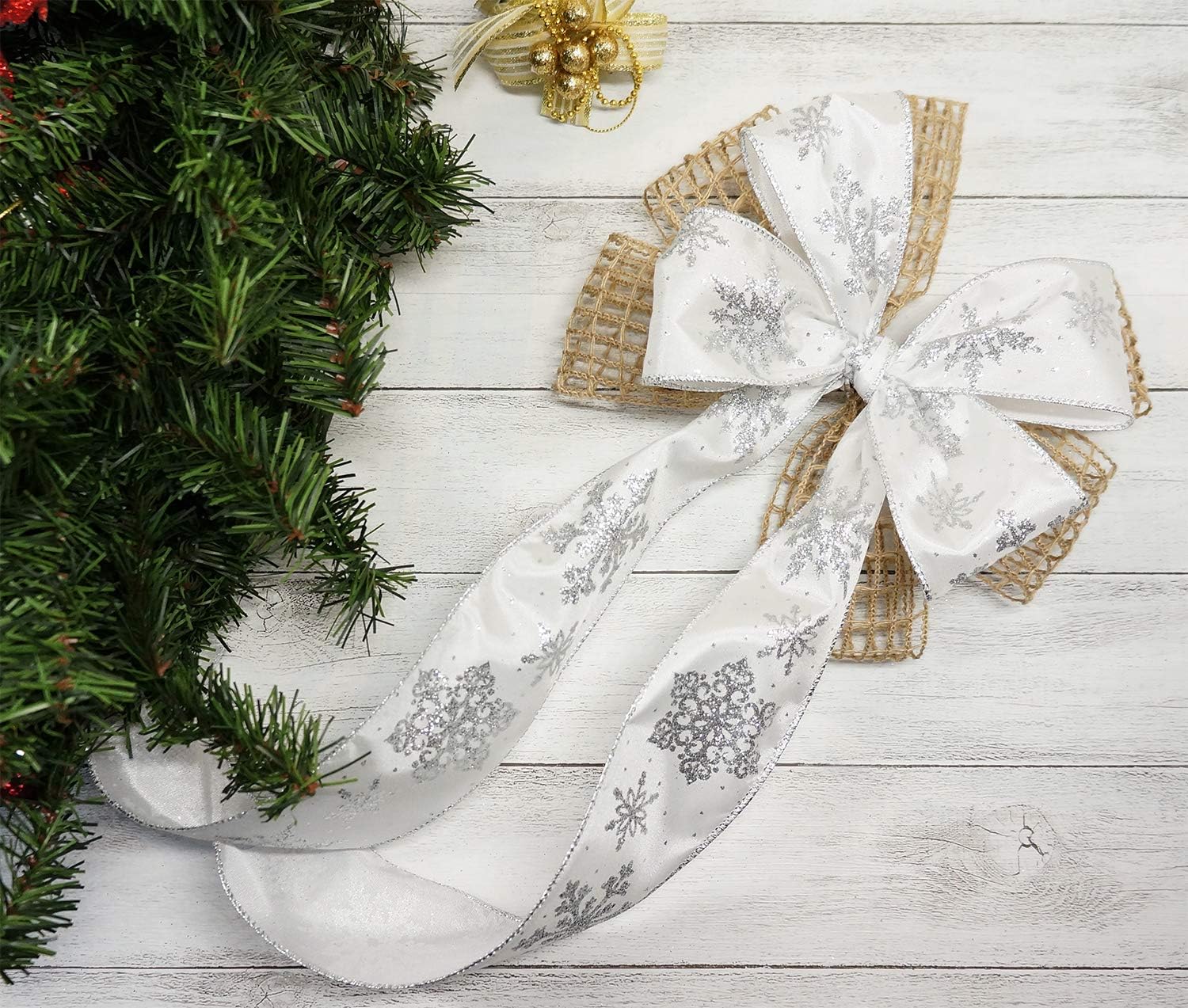 - GREAT WORKMANSHIP - Our White Satin with Silver Snowflake Wired Ribbon 2.5" has a density weave so you won’t find any loose edges. You won’t find any fraying ends or loose strings anywhere, making our White Satin with Silver Snowflake Wired Ribbon 2.5" perfect for high-end and professional DIY works and Crafts.