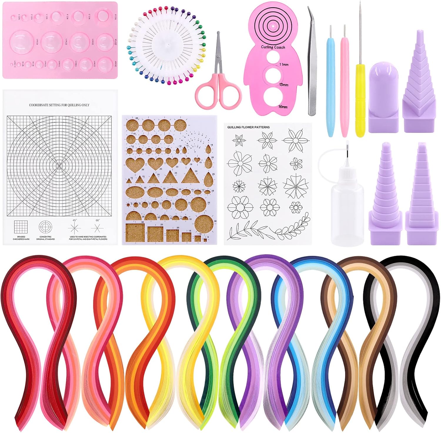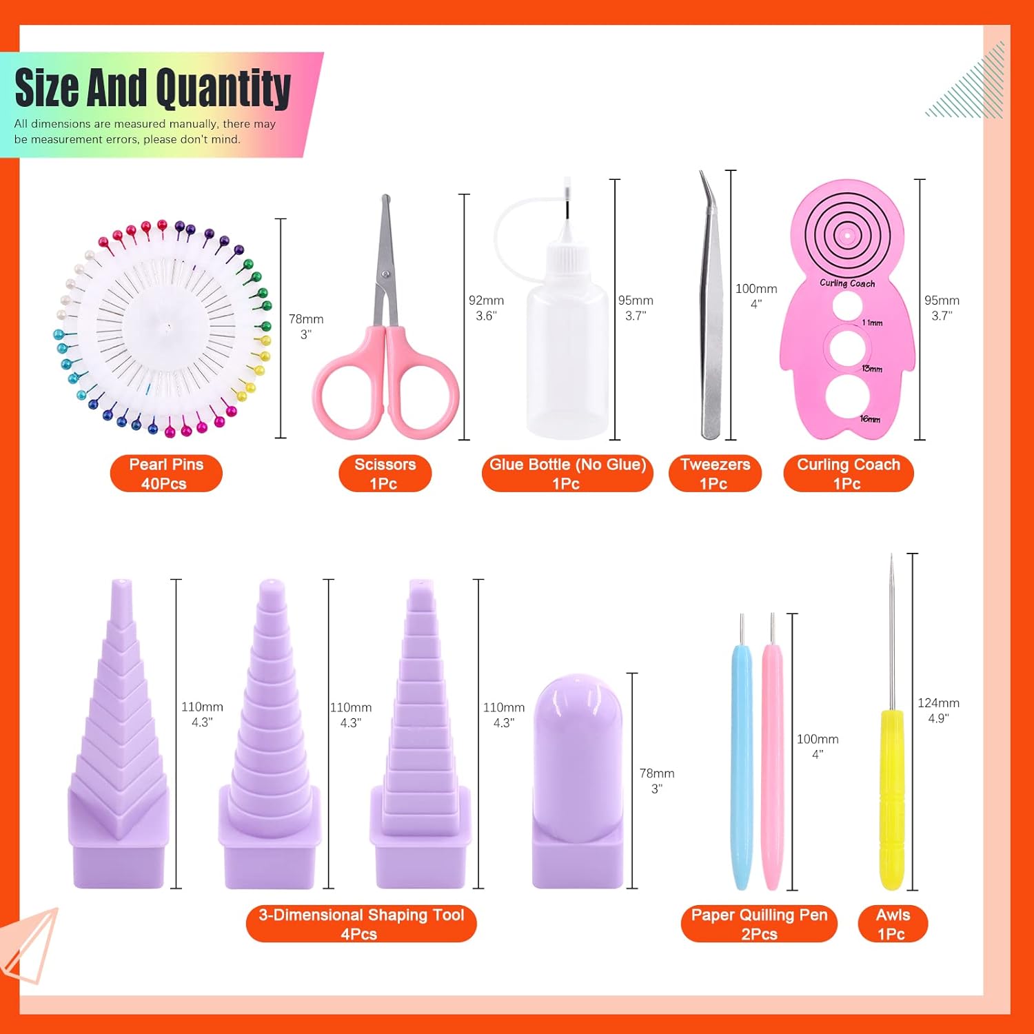 - š· [Multi Quilling Tools and Supplies]- Paper quilling set includes 9 set quilling paper strips, 40 x pearl pins, 2 x paper quilling pens, 1 x awl, 1 x scissors, 1 x tweezers, 1 x quilling board, 1 x bump styler mold, 1 x curling coach, 1 x quilling flower patterns, 1 x glue bottle(no glue) and 1 x quilling paper stencil, 4 x 3-dimensional shaping tool, total 64pcs. Complete kit for you DIY handcraft.