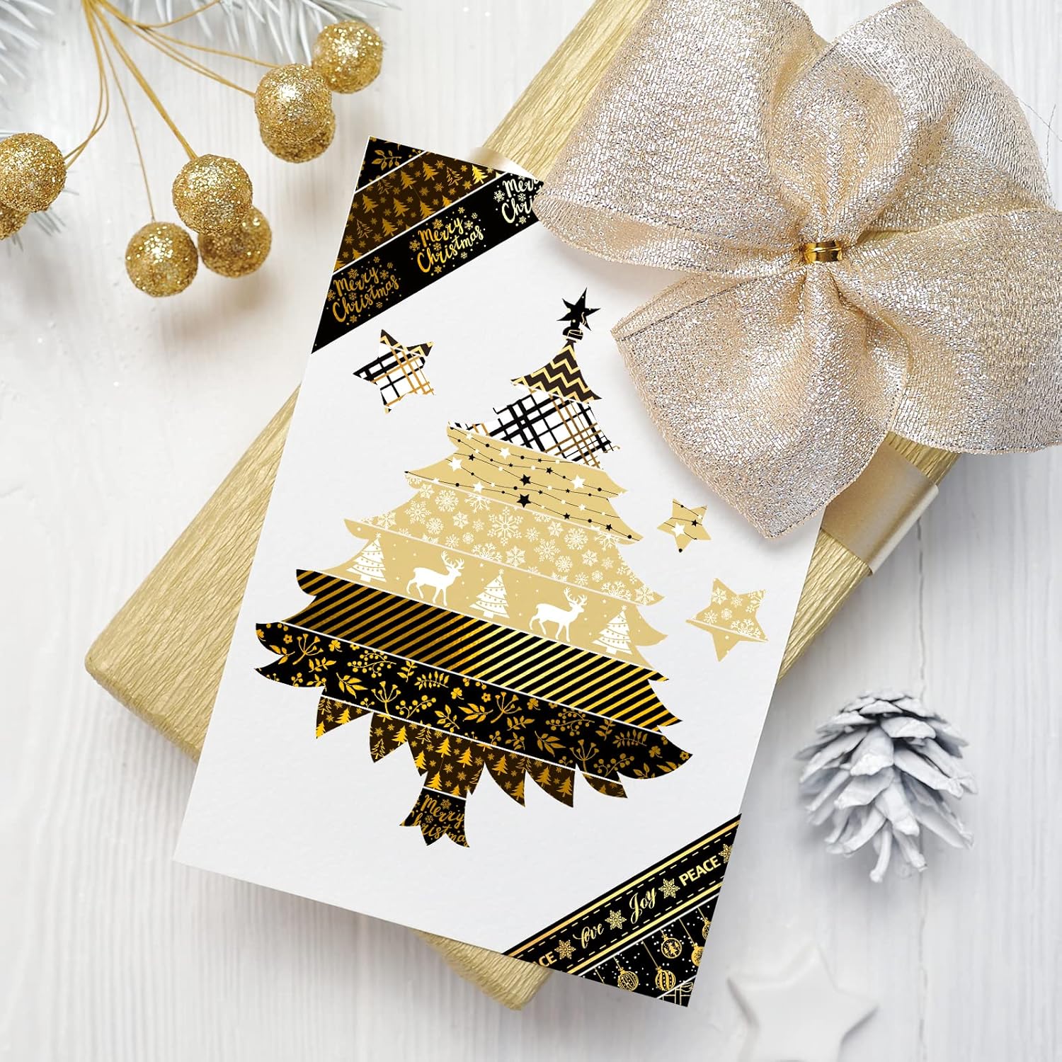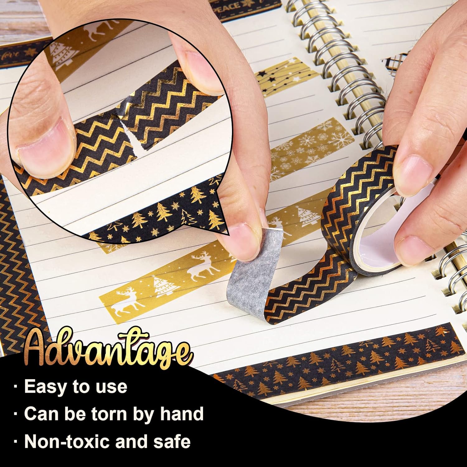 - Black & Gold - Our washi tapes take black and gold as theme color, patterned with foil gold snowflakes, Xmas tree, plaids, reindeer, ball ornament, etc., vintage colors and exquisite patterns that are quite suitable for Christmas and winter decor.