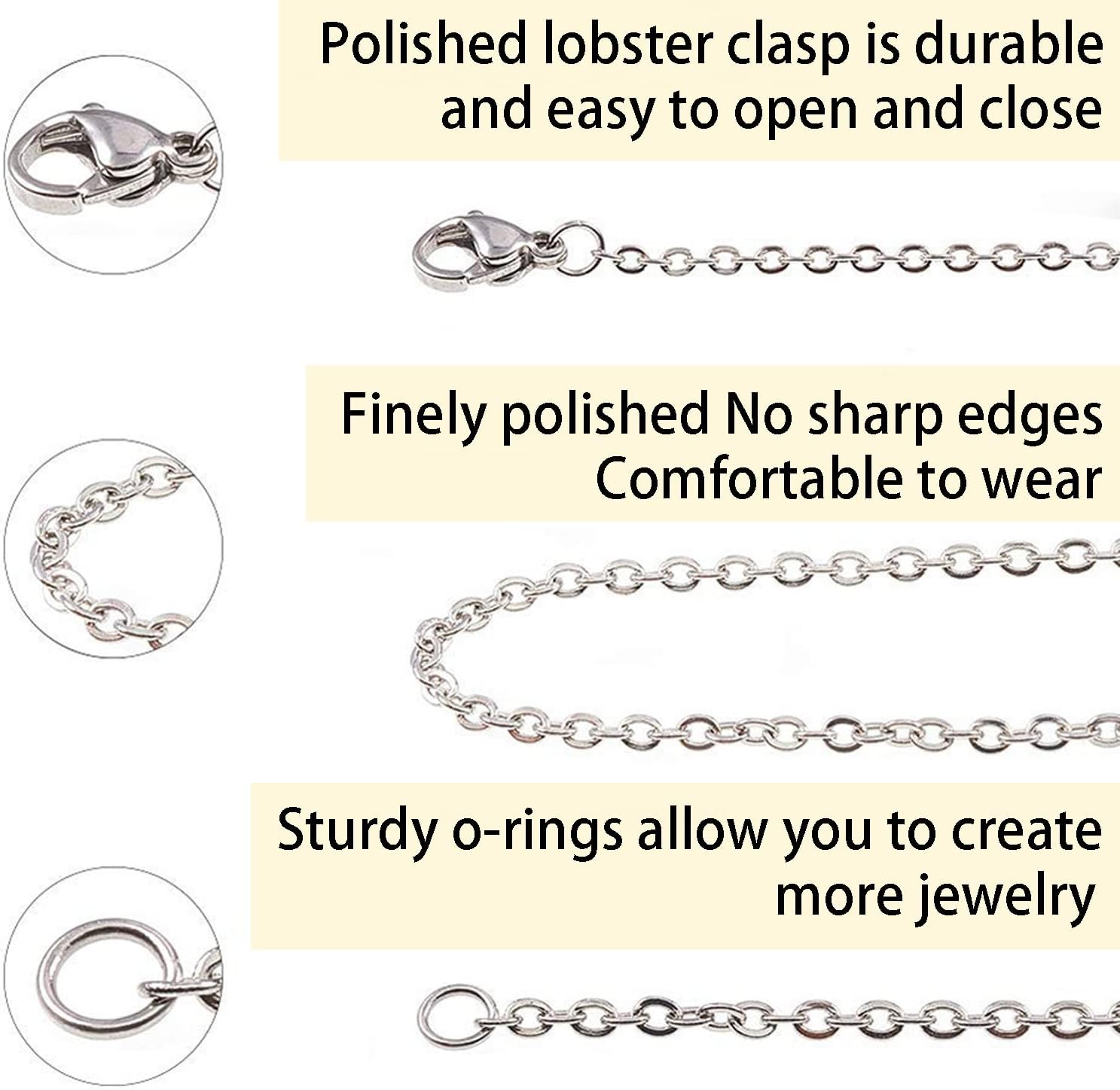 - THIN & STRONG: The size of the chain links are 2.5mm long, 2.0mm wide, 0.5mm thick; the lobster clasps are 10.0mm long, 5.0mm wide; the jump rings are 4.0mm long, 4.0mm wide - Small, fine, but strong and sturdy. Great for jewelry findings and supplies.