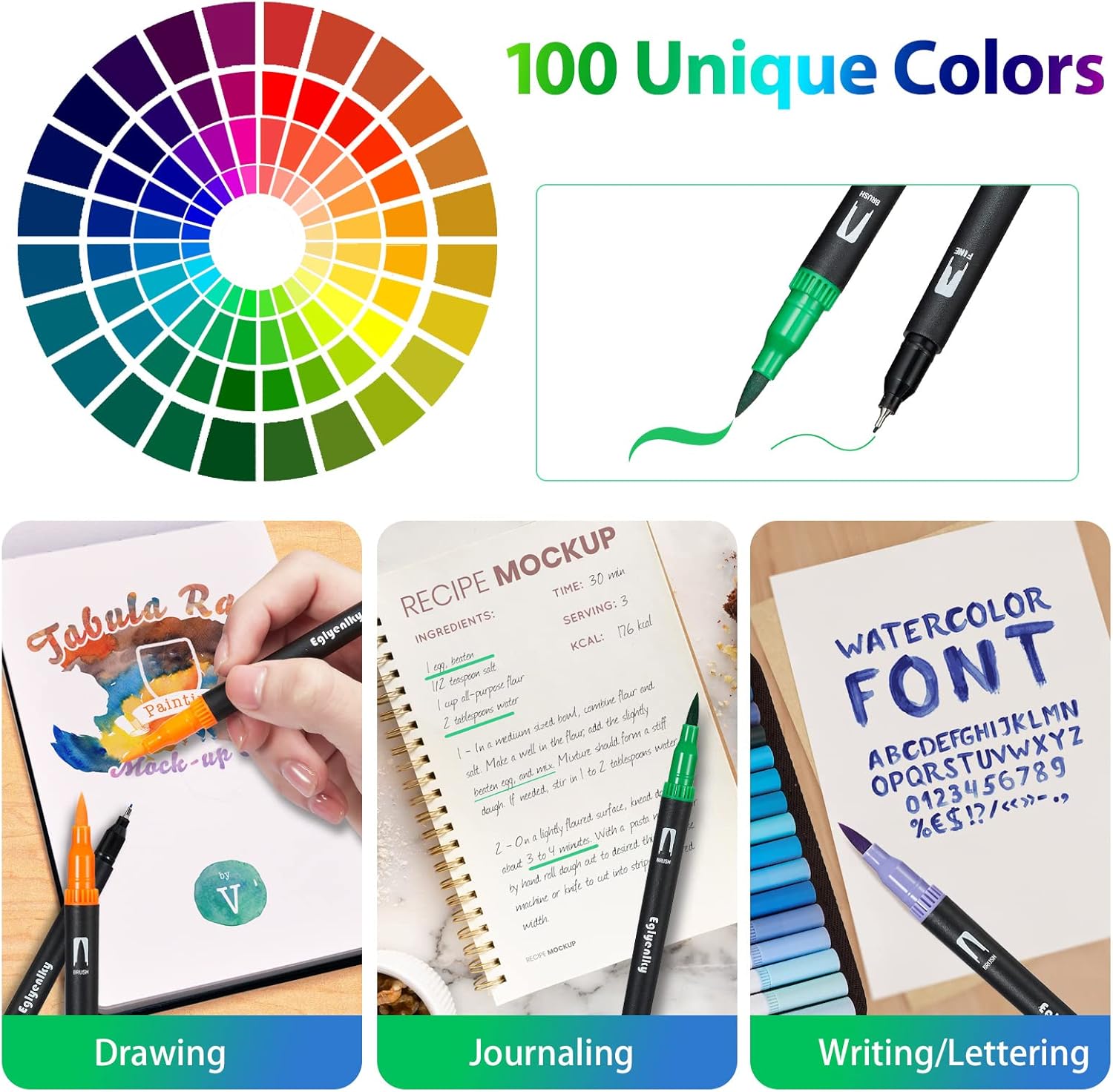- 100 UNIQUE COLORS - Every dual brush pens set consists of 100 various bright colors and every color is unique. The ink of dual tip pens set is water based, which meets the needs of adults and beginners for coloring pursuits. And kids also can use the coloring markers easily.