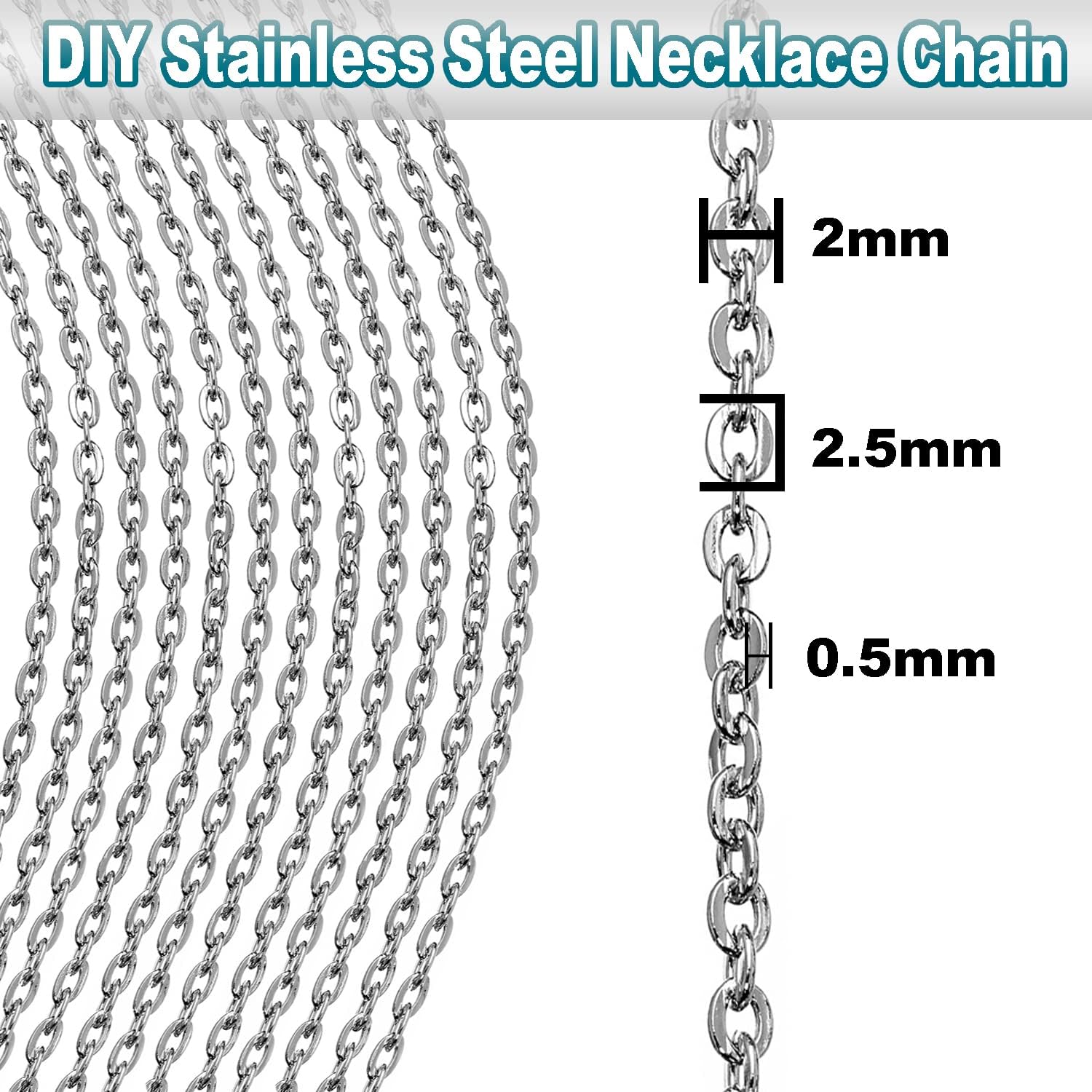 - THIN & STRONG: The size of the chain links are 2.5mm long, 2.0mm wide, 0.5mm thick; the size of the lobster clasps are 10.0mm long, 5.5mm wide; the size of the jump rings are 4.0mm long, 4.0mm wide - Small, fine, but strong and sturdy. Great for jewelry findings and supplies.
