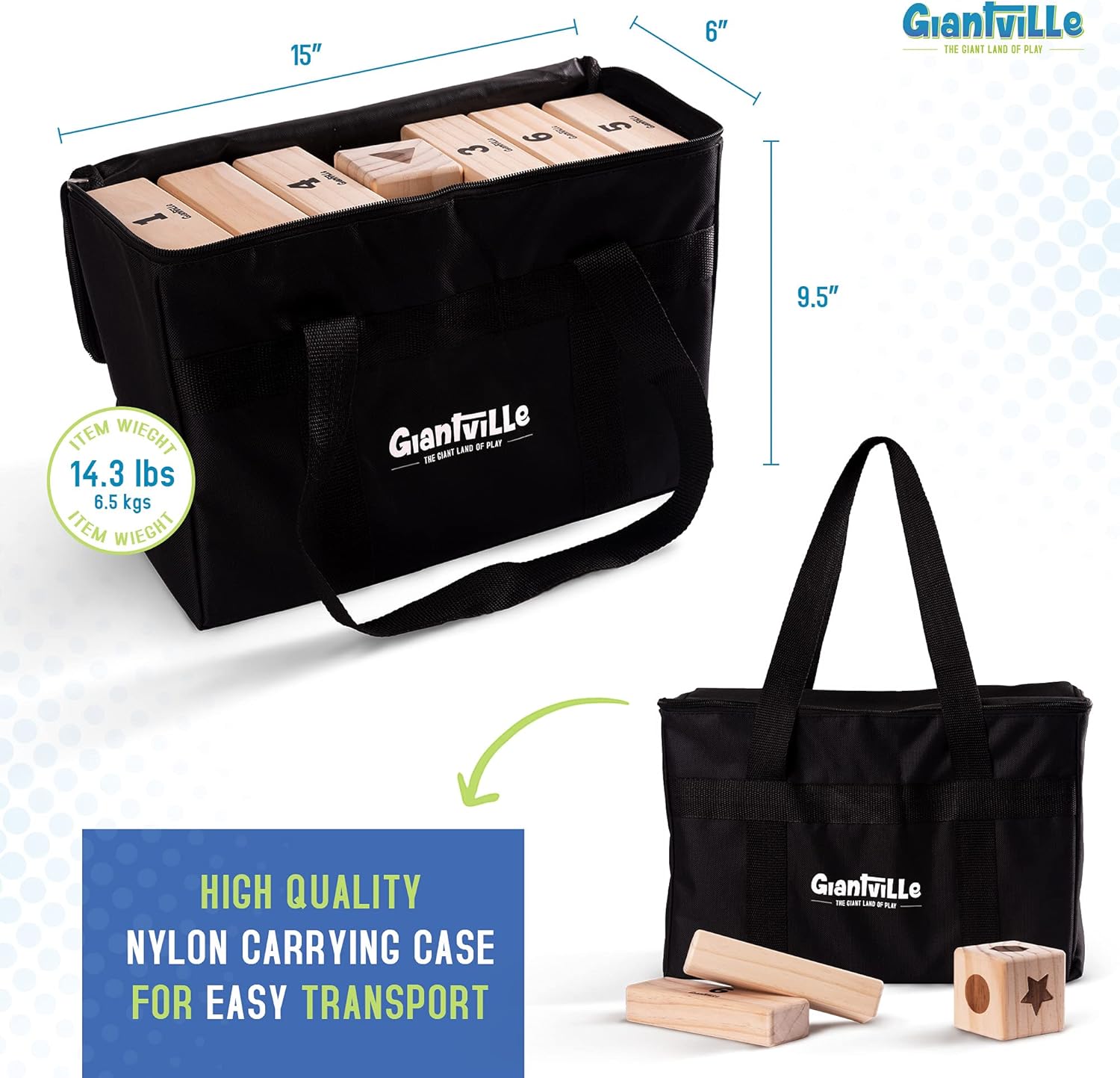 Giantville Giant Tumbling Timber Toy - Premium Pine Wood Life-Size Blocks Tower - Big Floor/Board Indoor/Outdoor Yard Game for Kids & Adults - 54-Pieces + Dice + Carry Bag - Grows to Almost 4-Feet