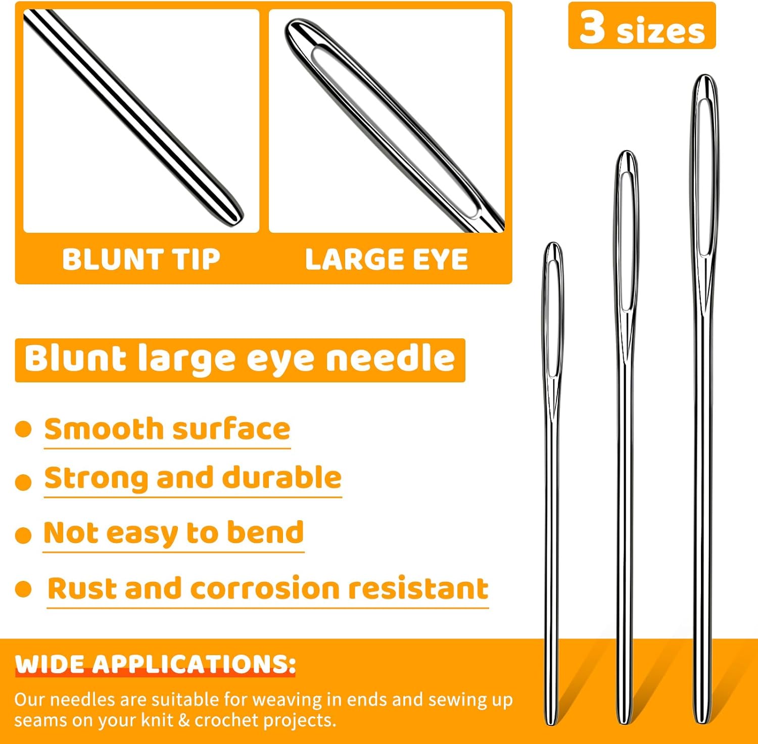 - Big Eyes Needles: Due to the extra-large eye, the stitching needles are easy to thread yarn through even without a threader.