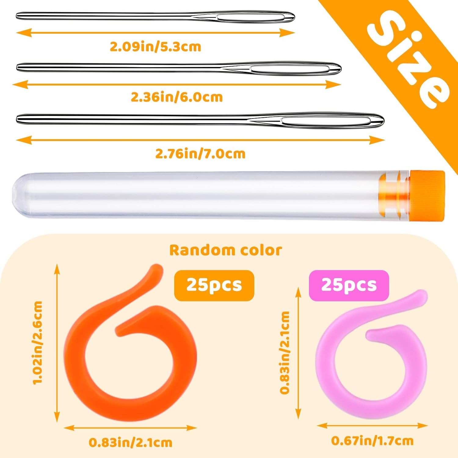 - 53 Pcs Sewing Accessories: Comes with 50 pieces of knitting stitch rings, which contains 25 bigger pieces and 25 smaller pieces. In addition, there are 3 big eye yarn needles for your sewing.