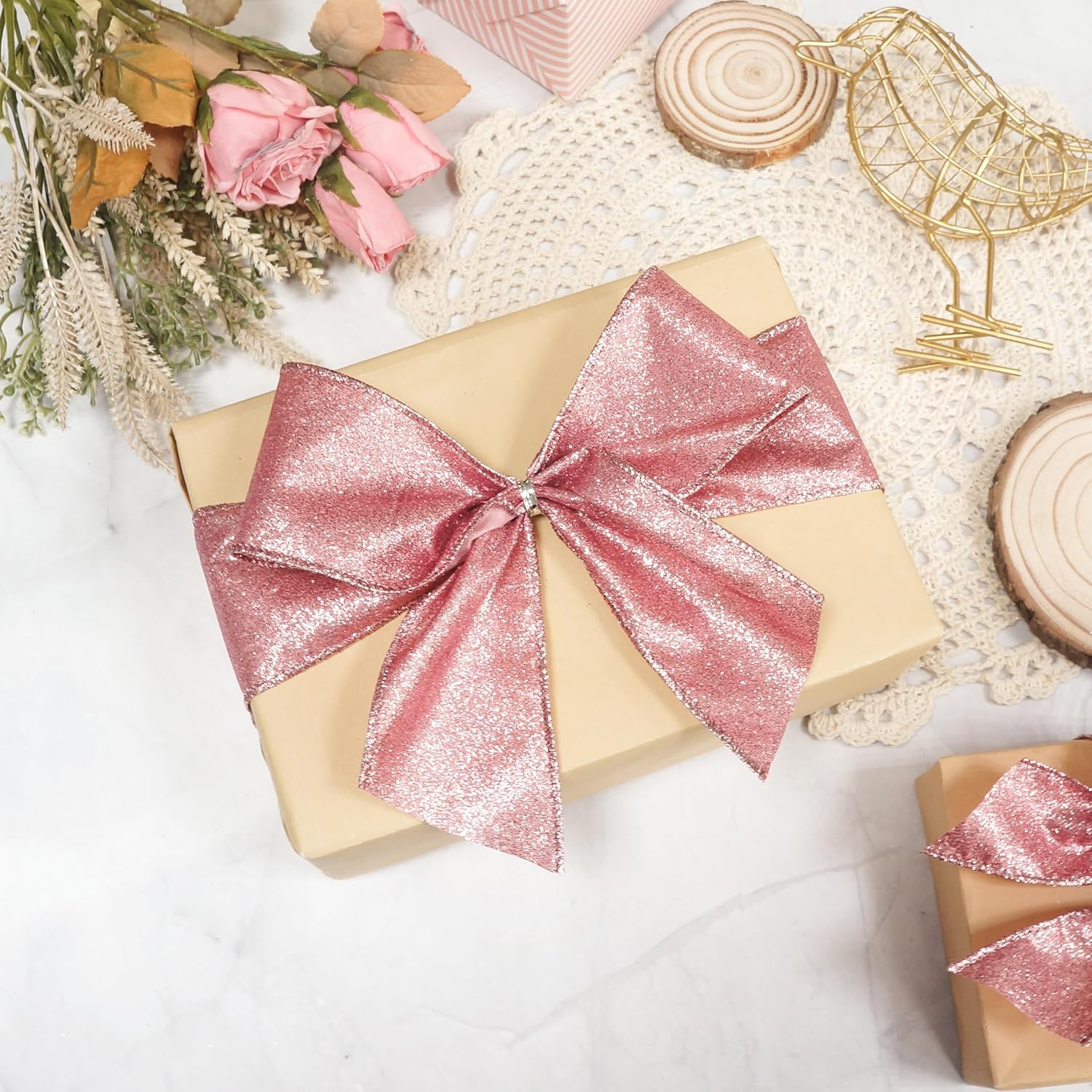 - OCCASION - Our Glitter Wired Ribbon 2.5" rose gold color are very easy to match and suitable for birthdays, party decorations, Mother's Day, Valentine's Day, Easter, Independence Day, Halloween, Christmas, New Year's gifts, Wedding decorations, Baby showers etc.