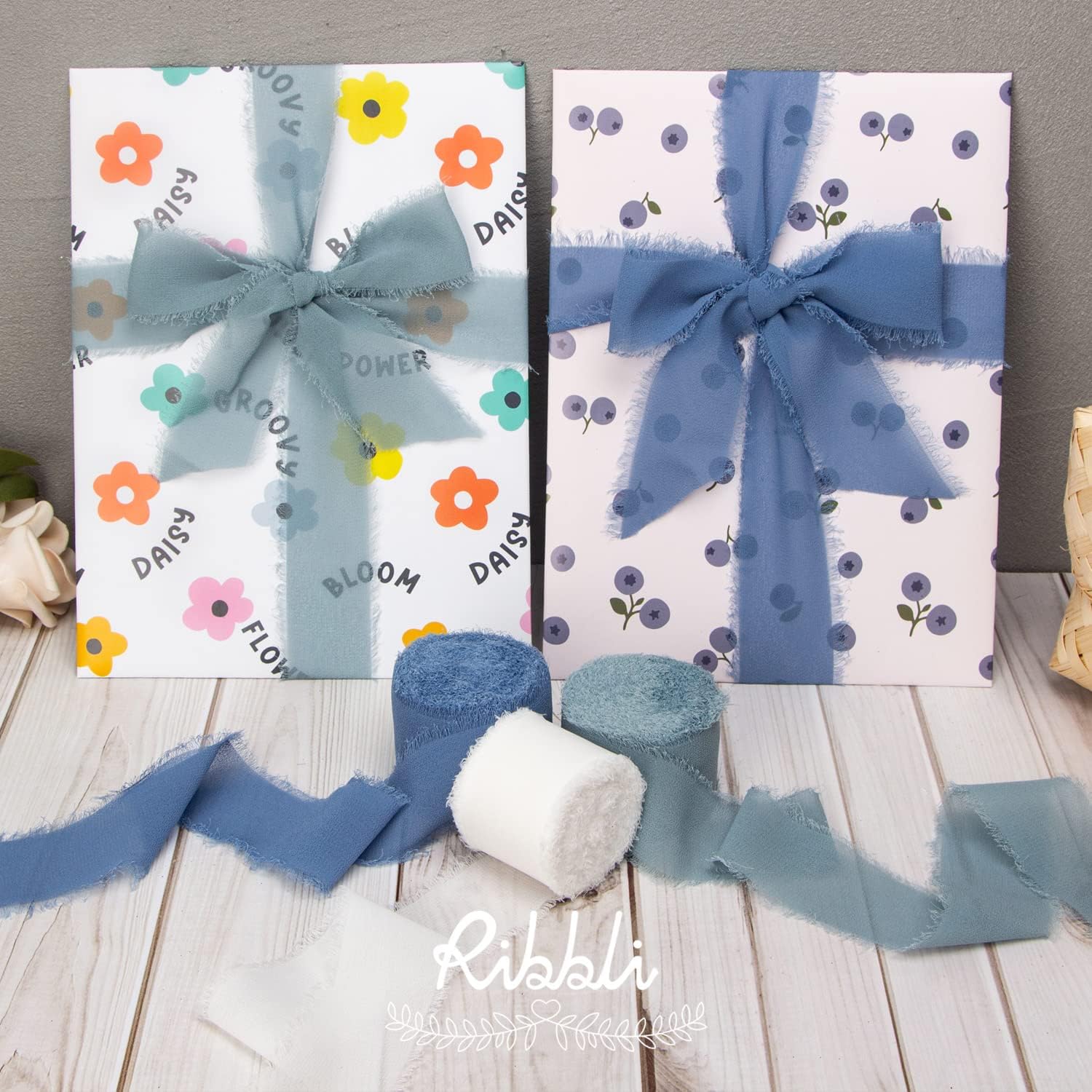 Ribbli Slate Blue Chiffon Ribbon 1-1/2 inch x 20 Yard Handmade Fringe Chiffon Silk Ribbon for Wedding Invitations, Bridal Bouquets Wrapping, Flower Arrangement Decoration