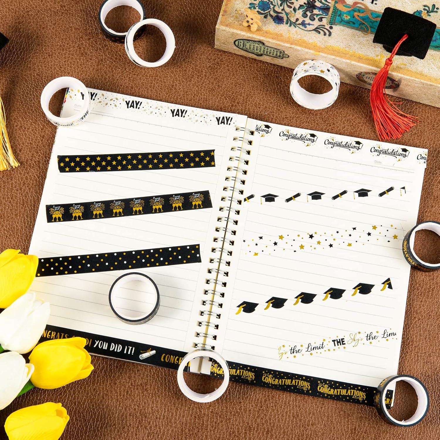 - Graduation Theme - Our washi tapes take black and foil gold as theme colors, pattered with grad cap, diploma, stars, printed with the words of congrats grad, you did it, congratulations, etc., suitable for school crafts.