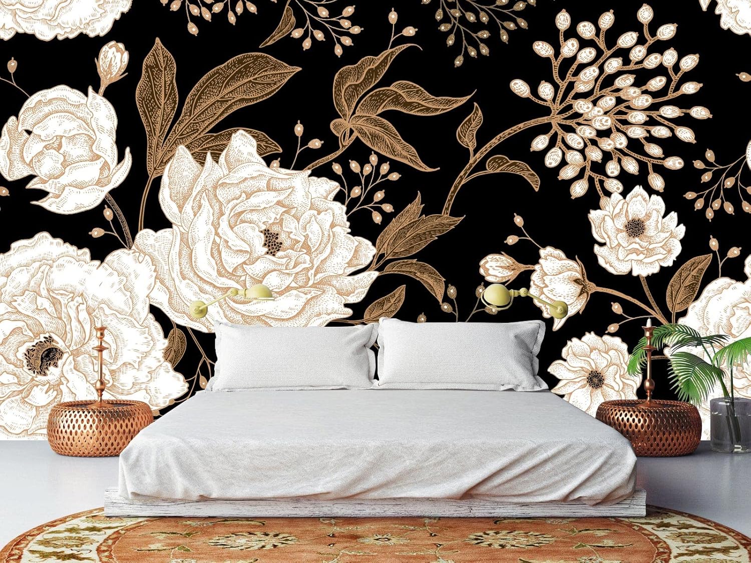 Wall Mural Peonies and Roses Floral Vintage Wallpaper Seamless Gold White Flowers Wall Coverings for Living Room Bedroom Kids Room(Not Peel and Stick)