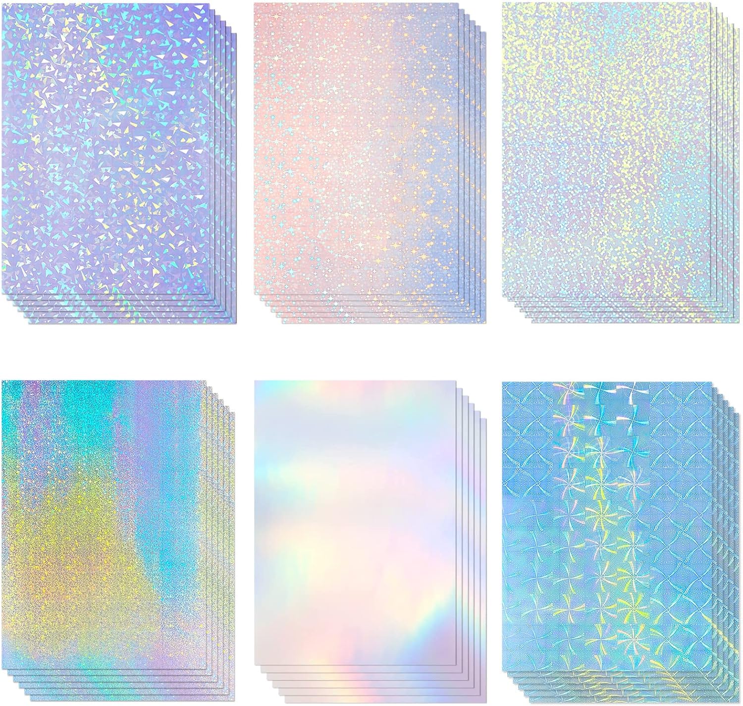 - Abundant Style and Quantity: you will get 60 sheets of transparent holographic films in 6 different styles, including dots, broken glass, stars, pinwheels etc., 10 for each style; These A4 holographic sticky paper sheets are in A4 size, namely 11.7 x 8.3 inches, enough to meet your different needs; Please note that these films are not printable, do not use them on printers