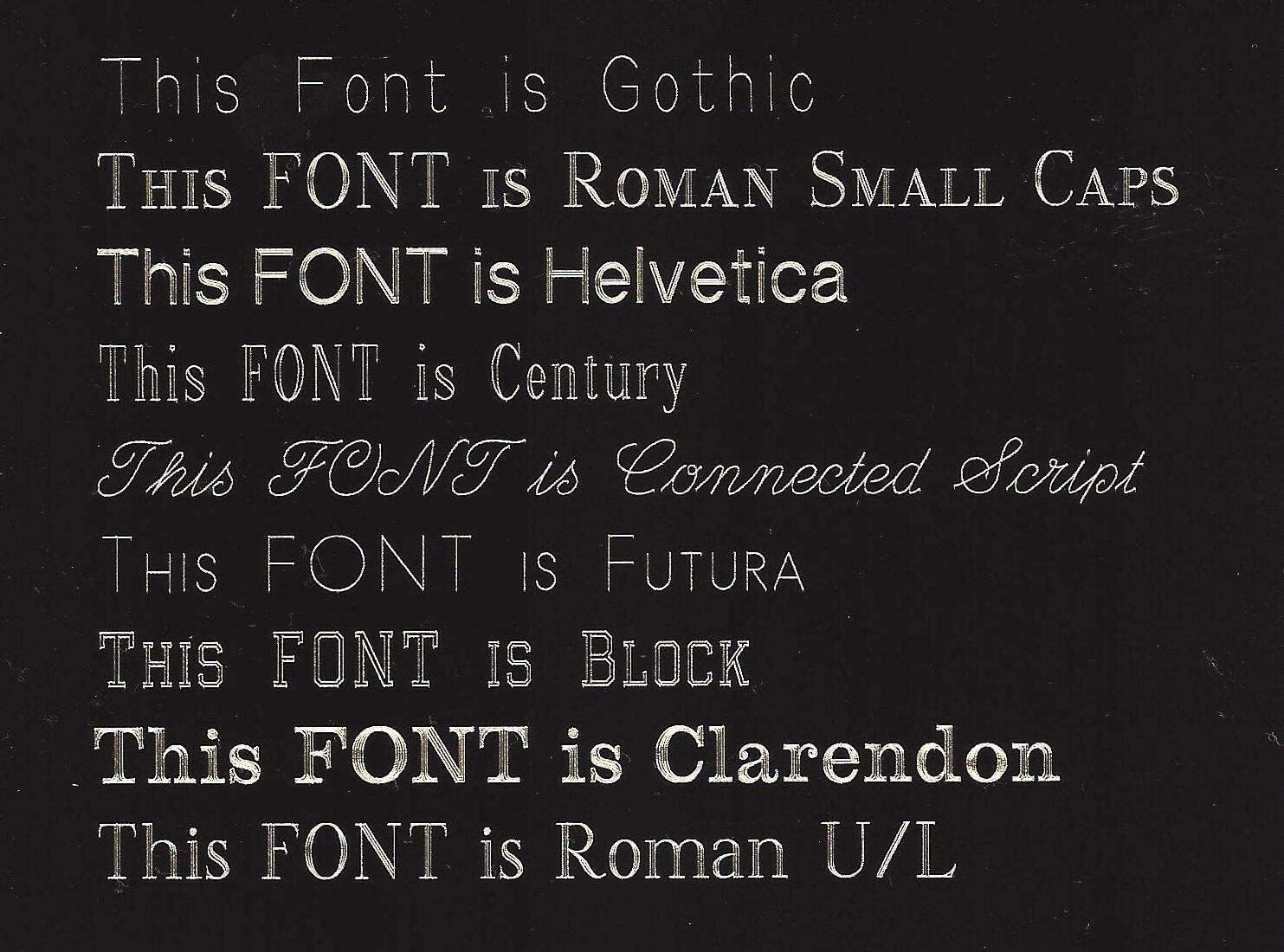 - ·Each line can have up to 50 characters including spaces. Please keep in mind, the more text per line, the more narrow the engraving will be.Please be aware that single line engraved fonts (Gothic, Futura, Contemporary, & Connected Script) are difficult to read on Gold and White plates.