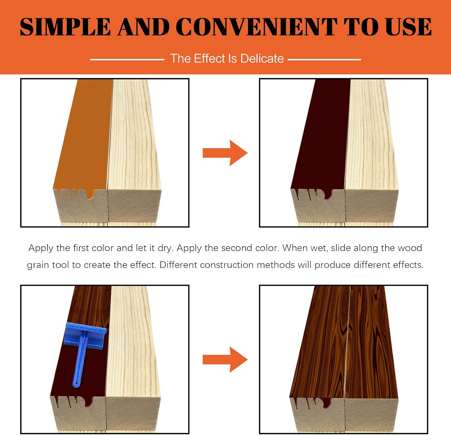 - šÆ[Easy to Use] You just need to paint the first color and let it dry. And then paint the second color. When the wall is still wet, slide along the wood grain tool to create the wood effect. Besides, our wood grain tools are easily washed with soap and water. You don't need to worry about the paint from last time will affect the next-time use.