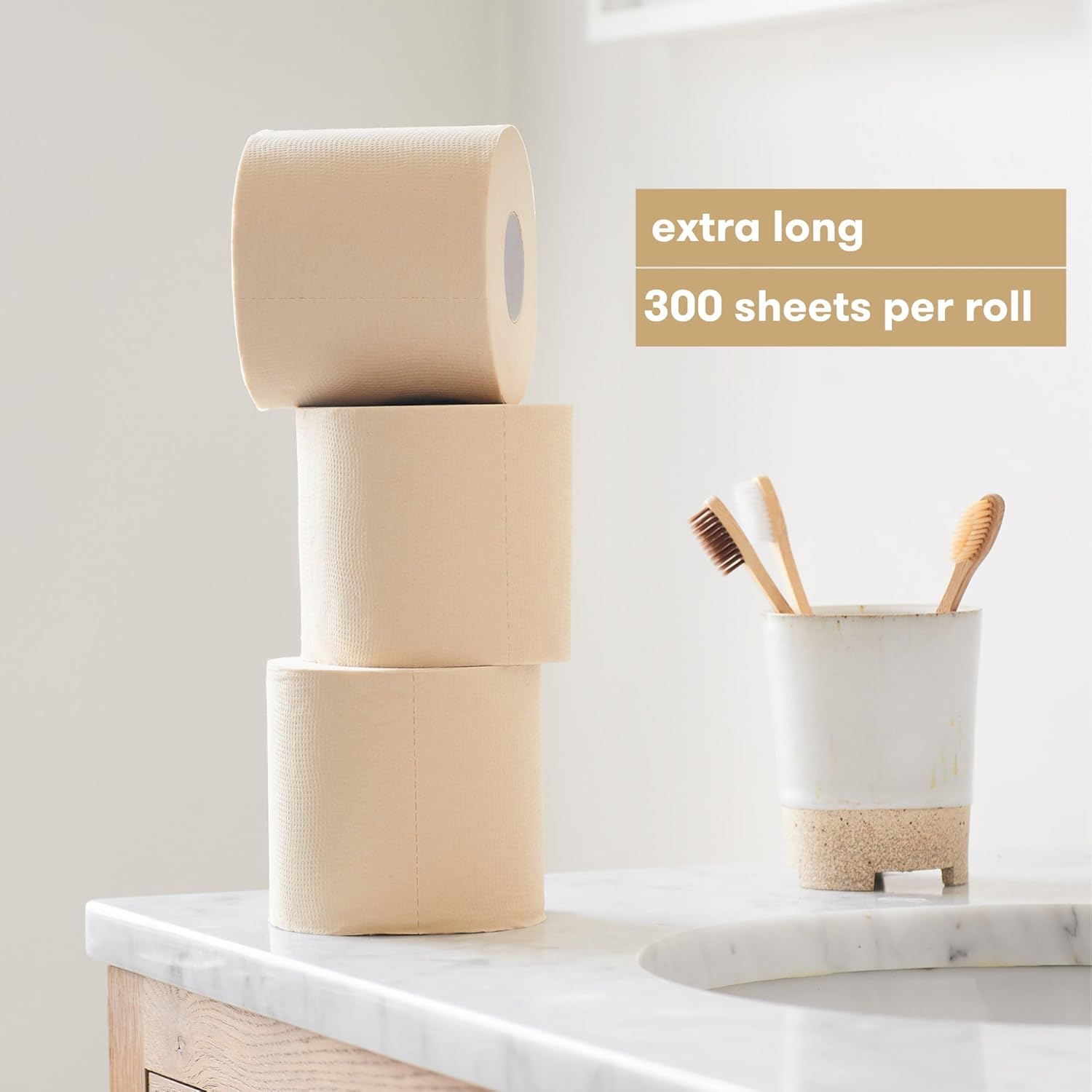 - 100% BAMBOO TOILET PAPER: A premium 3 ply bamboo toilet paper roll that is exceptionally soft, strong and ultra-sustainable. Each toilet roll contains 300 sheets (50% more than popular brands with 180-200 sheets per roll). Now available in a space saving 24 roll pack – ideal for those with limited storage at home.