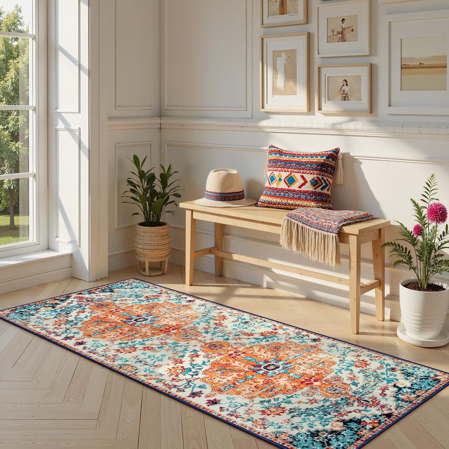 Lahome Bohemian Floral Medallion Runner Rug - 2'8" x 8' Oriental Distressed Hallway Runner Rug Country Vintage Washable Non-Slip Laundry Carpet Soft Low-Pile Indoor Mat for Entryway Bedside Decor