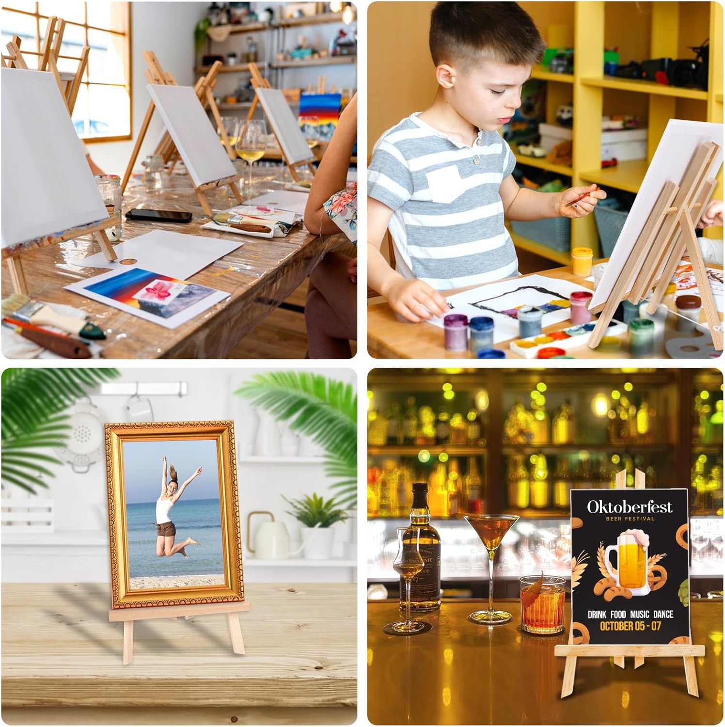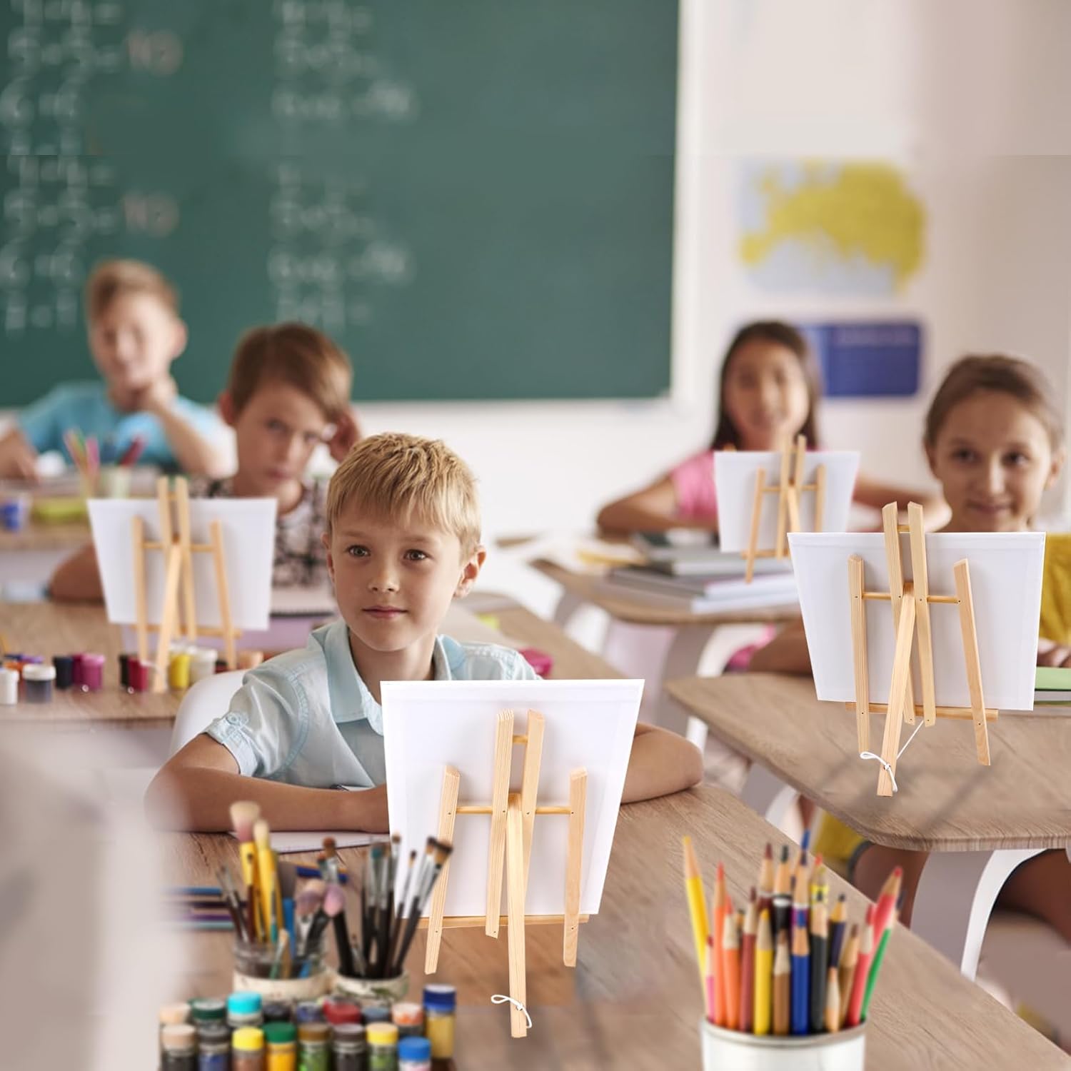 - 【High quality】: 10pcs 7.1 "x 11.8" inch sturdy "A" wooden easels. Our easels are made of sturdy pine and last a long time. The rear tripod is secured by ropes to keep the easel balanced and not easy to fall off.