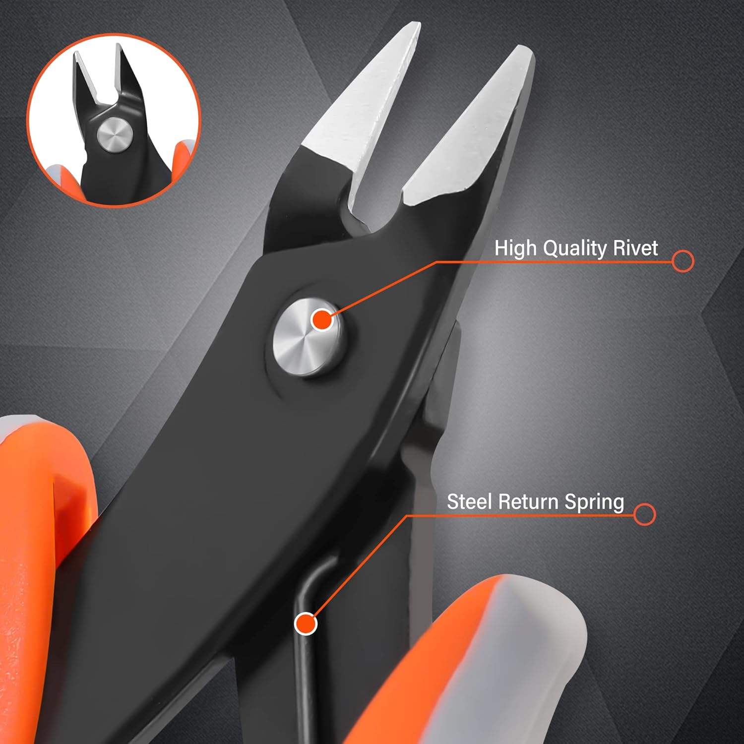 - ANGLED JAWS & SPRING: The curved bevel design of the pliers head is suitable for tight spaces and precision models. Ultra slim profile increases access in confined areas. The spring mechanism is smooth and reduce operator fatigue, labor-saving, suitable for long time work.