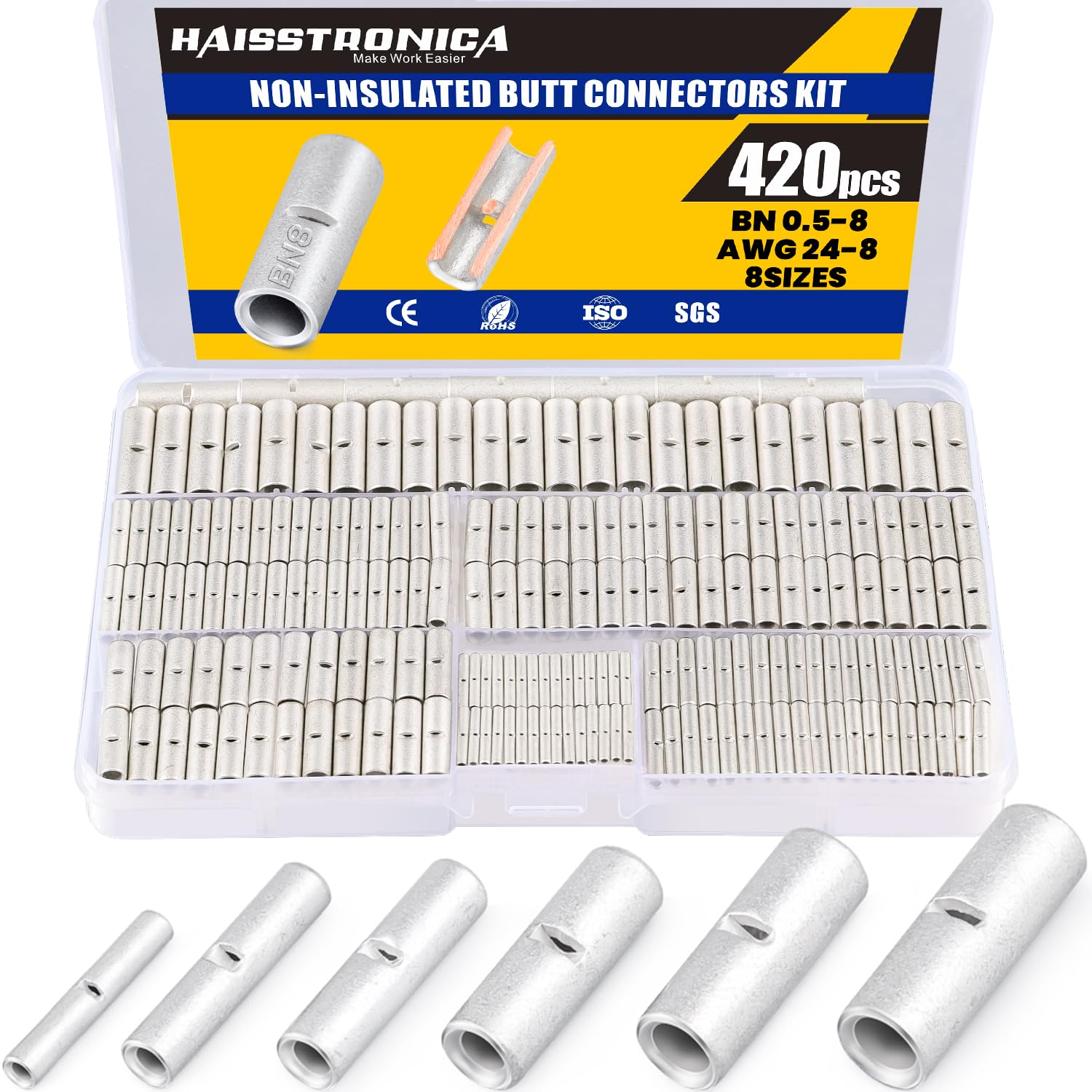 Haisstronica Non Insulated Butt Connectors Kit 420pcs Butt Connectors for Wiring Pure Copper AWG24-8 Wire Crimp Connector