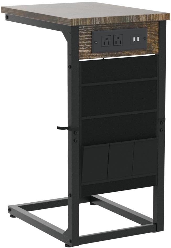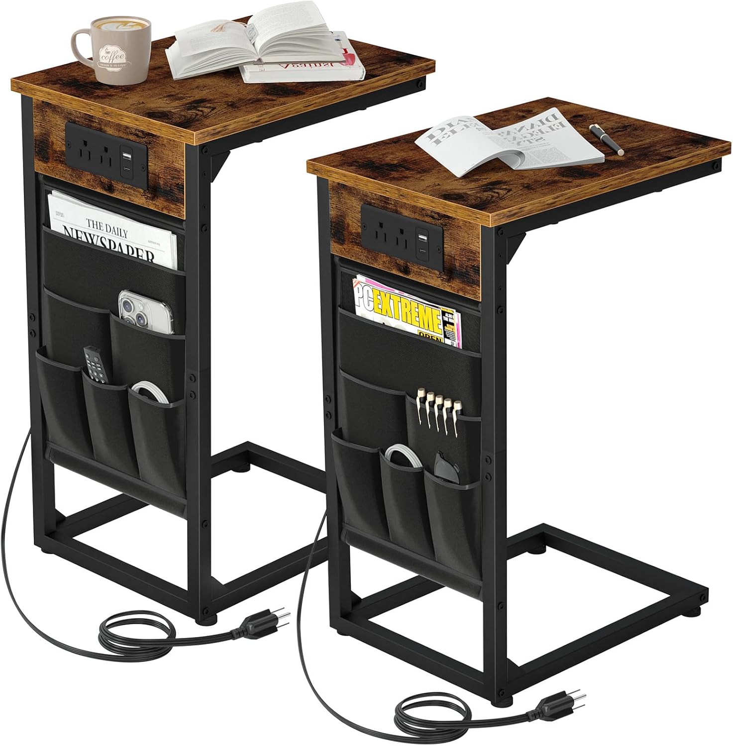 AMHANCIBLE C Shaped End Table with Charging Station, TV Tray Set of 2, Couch Tables with Storage Bag, Slide Under Sofa Side Table with USB Ports and Outlets for Living Room, Rustic Brown HET04CBR